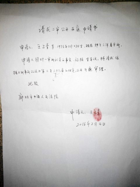下午一点半,律师早早来到看守所大门前,两点会见,会见完毕约两点半钟,律师和学员家属驱车赶往九十公里以外的廊坊市,大约四点到达廊坊市中院。开始说可以一个律师代办相关手续,后来又说不行,要律师依次一个一个的办理。律师们还要递交各自当事人关于要求二审公开审理的申请书,马维山律师还有一份补充证据需要递交,负责接待的法官说:“主管此案的法官陈克祥已经回湖南老家过年,我只接收委托手续,其它一概不收。”