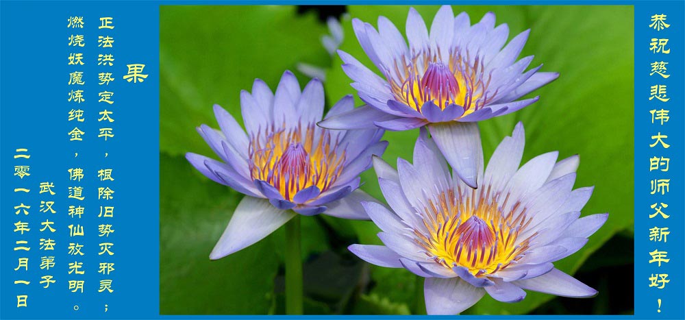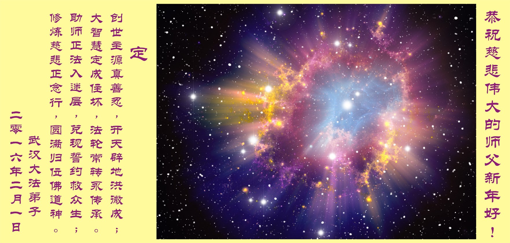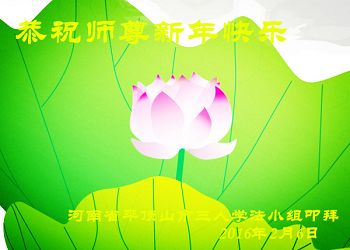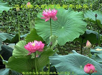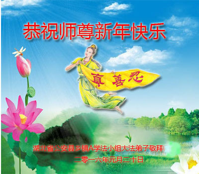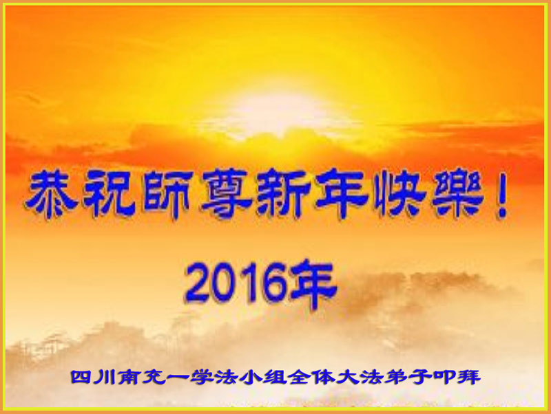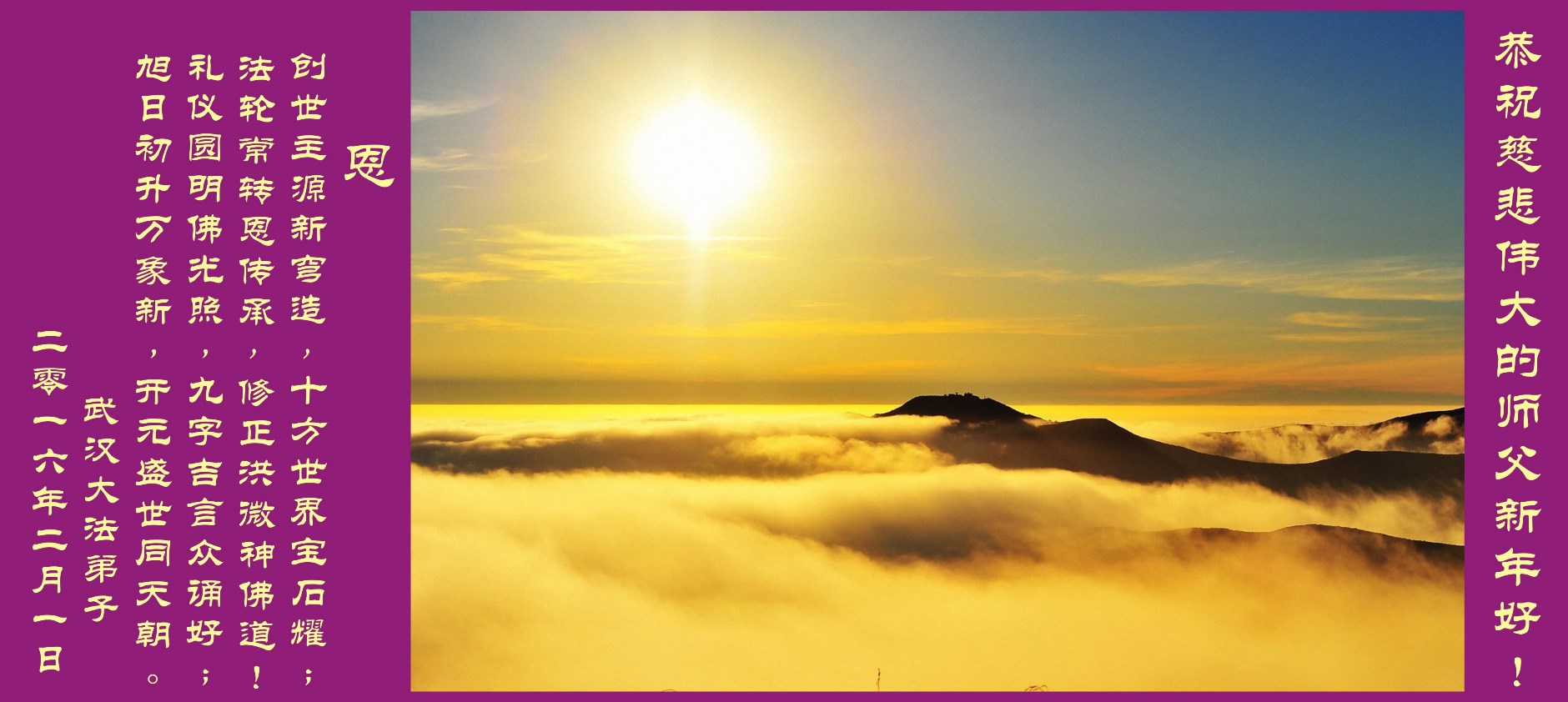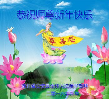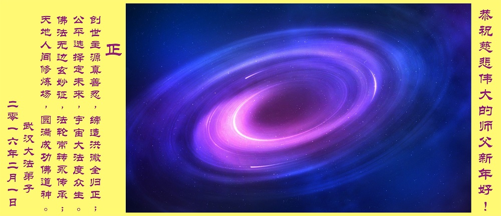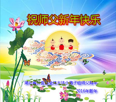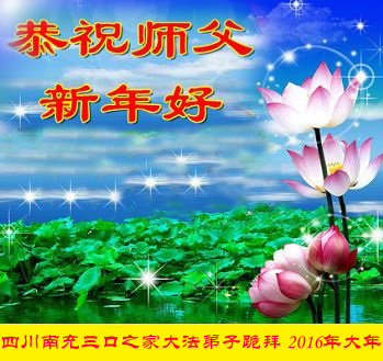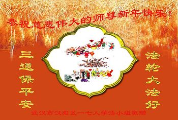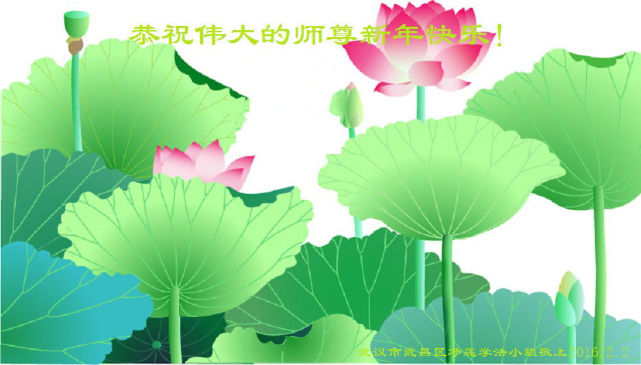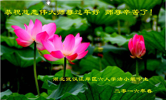 您好!我们是武汉市江夏区一学法小组的学员,在2016年新年到来之际,恭祝慈悲伟大的师尊新年快乐!万事如意!在新的一年里,我们一定要听师尊的话,更加精進,多救人!