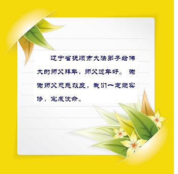 我是2011年得法的新学员。我想代表我和仍在冤狱中的爸爸、妈妈给师父拜年!还有我们学法小组的同修阿姨们,我们祝愿师父新年好!