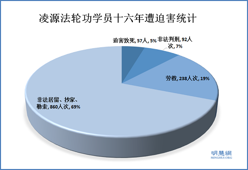 十六年来,凌源被迫害致死的法轮功学员57人,判刑92人次,劳教238人次,非法拘留、抄家、罚款勒索860人次,勒索钱财210多万元。迫害致精神失常九人,十四名精神正常的人被关进精神病院,许多家庭妻离子散,家破人亡。