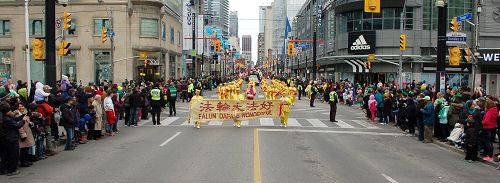 自二零零七年开始,今年已经是法轮大法团队连续十年受邀参加这个一年一度的盛大游行。法轮大法团队英姿飒爽、服装颜色亮丽,在游行队伍中格外显眼。当旋律优美动听的《法轮大法好》、《法轮圣王》和《永远的枫叶》等乐曲一响起时,路旁的观众就闻乐起舞、陶醉其中。路上华人喜闻法轮大法真相,欣然退出中共党团队(“三:退.”)。