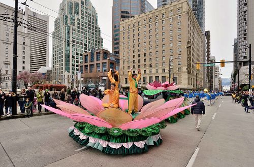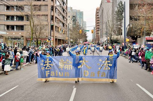 温哥华法轮功学员的游行队伍包括天国乐团、花车、腰鼓队、法轮功功法演示队。沿途观众纷纷为他们鼓掌,很多人随着天国乐团的节拍向法轮功学员挥手致意,还有很多观众拍摄这支精彩的游行队伍。华人观众表现得尤为热烈,当法轮功团体经过时,很多人都表现出期待与欢喜的神情。还有华人留学生们,看到法轮功团体出现时,有的鼓掌,有的招手致意,有的拍照录像留念。