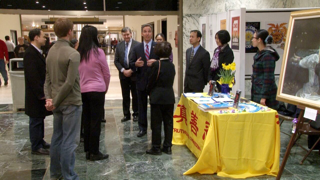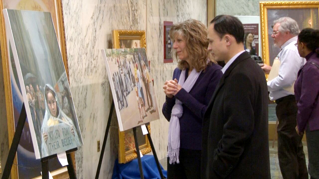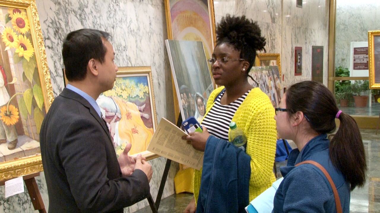 尔巴尼展方负责人郑女士表达举办画展的目的:“希望纽约州全部的议员,不管是众议员还是参议员,还有他们的工作人员,都能知道法轮功在中国大陆被迫害的真相,并能给予正义的支持。”