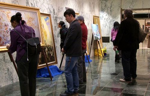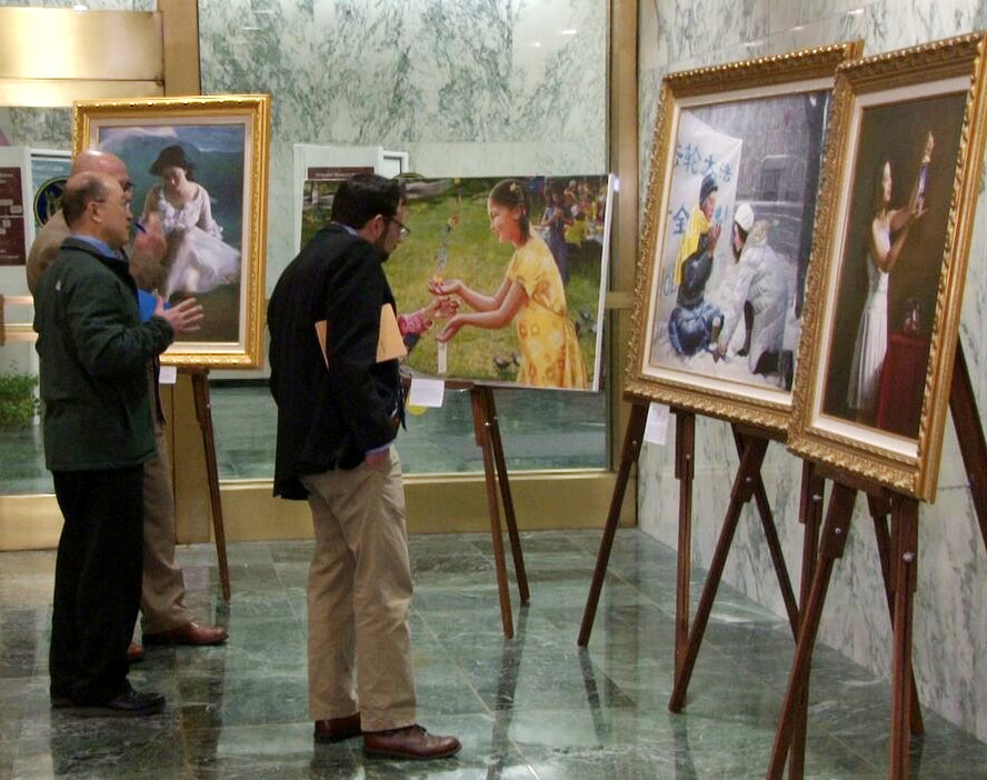 本展览共展示了二十幅画作,生动的表达了法轮大法的美好,和法轮功学员在残酷的迫害中坚守信仰的场景。周一到周三是参众议员在州立法院办公的繁忙日子,周二是纽约州民众向议员们陈情的日子。画作陈列在参众议员进出办公室的必经之路上,非常醒目。