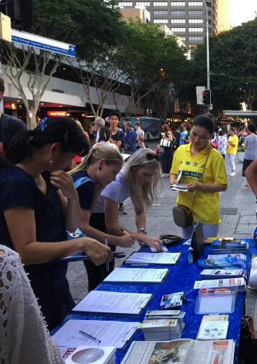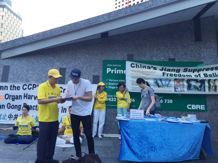 当天是周五,人流熙熙攘攘,许多行人驻足听学员讲真相,纷纷在制止迫害、声援控告迫害法轮功的元凶江泽民的征签簿上签名,还有很多人以自己个人名义在给澳洲总理特恩布尔(Malcolm Turnbull)的明信片上签名,敦促特恩布尔在四月份访华时提出中国法轮功人权问题。