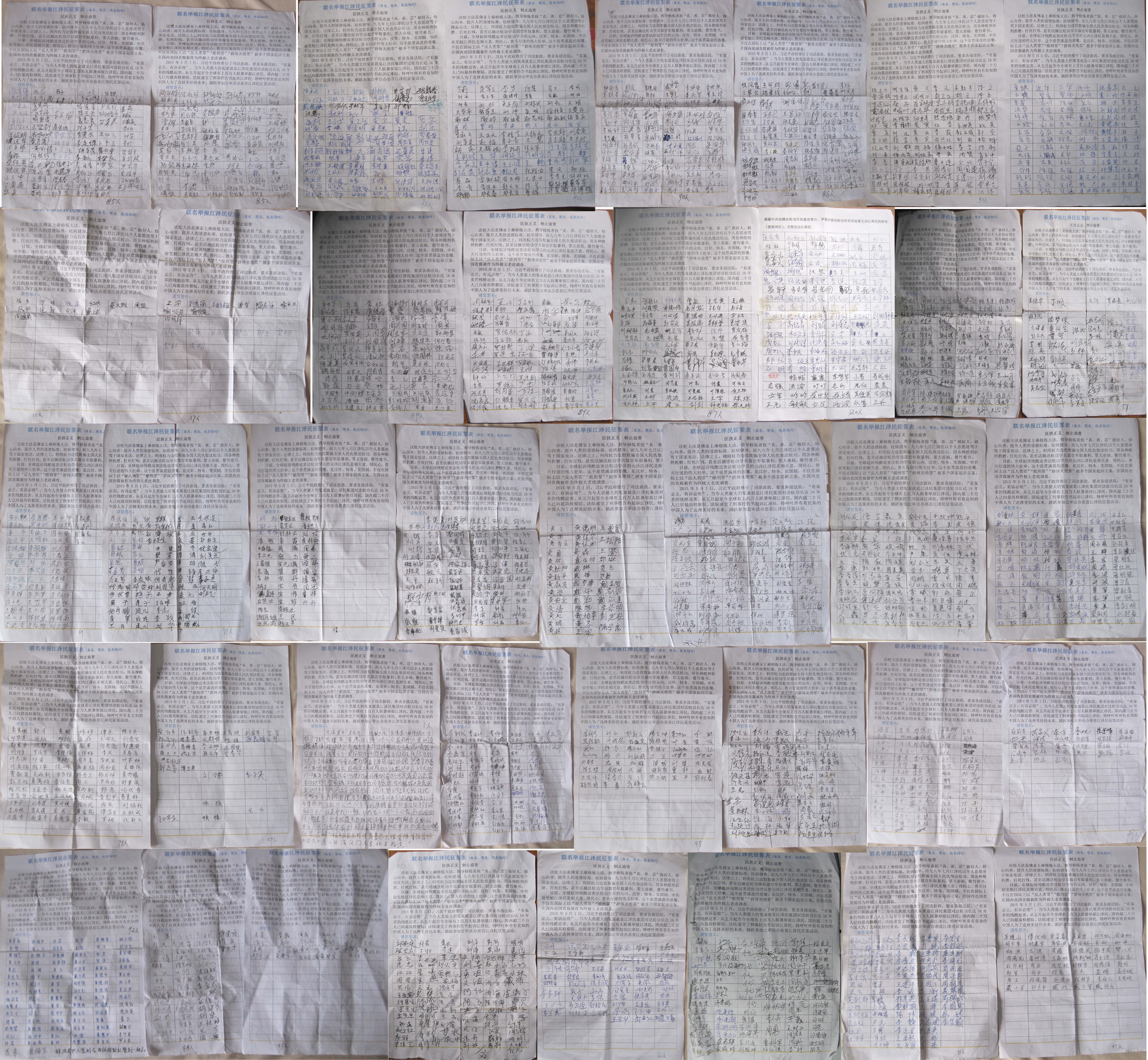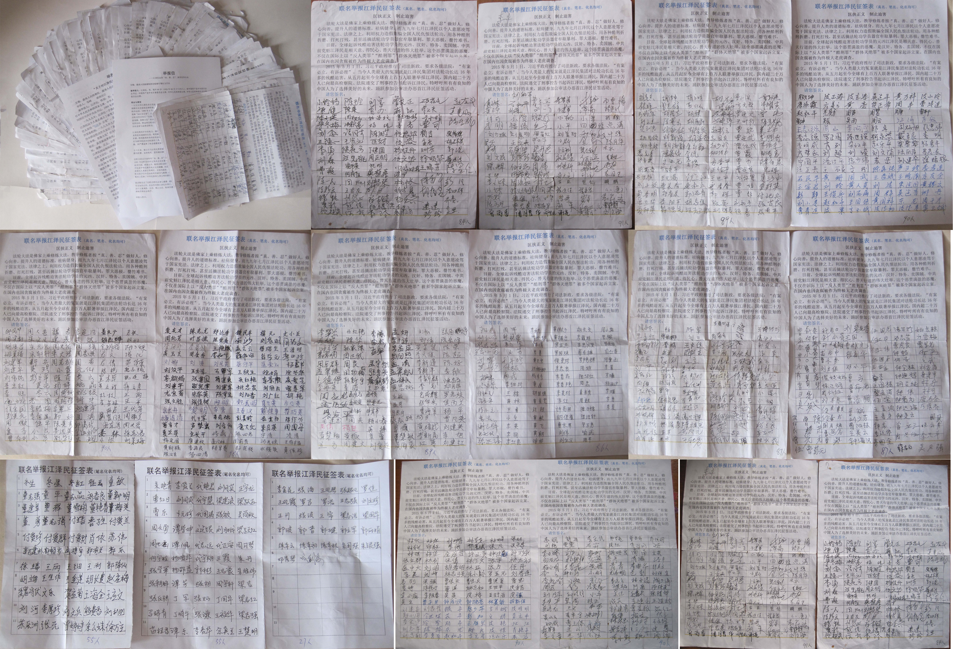 在征集联名举报江泽民的过程中,我们还目睹了越来越多的百姓在觉醒,人们在明白法轮功真相后,纷纷表示支持法轮功学员反迫害,正义声援逾二十万法轮功学员控告元凶江泽民,并主动在《联名举报江泽民征签表》上签名,要求最高检察院及最高法院对江泽民的违法犯罪行为进行立案侦查,将迫害好人的罪魁祸首江泽民绳之以法,还法轮功清白,使人类道德回升,实现民族复兴大业。