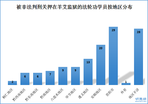 根据明慧网报道所做的不完全统计,被非法判刑关押在羊艾监狱的法轮功学员有 143名,其中刑期最长的十六年,最短的二年,有的学员多次被判刑迫害。案例涉及全省六个地级市,三个自治州。其中贵阳市: 36人;遵义地区:13人;安顺地区: 21人;六盘水地区: 13人;桐仁地区:2人;黔西南地区: 7人;毕节地区:9人;黔东南地区:6人;黔南地区:7人;外省:1人;地区不详:28人。