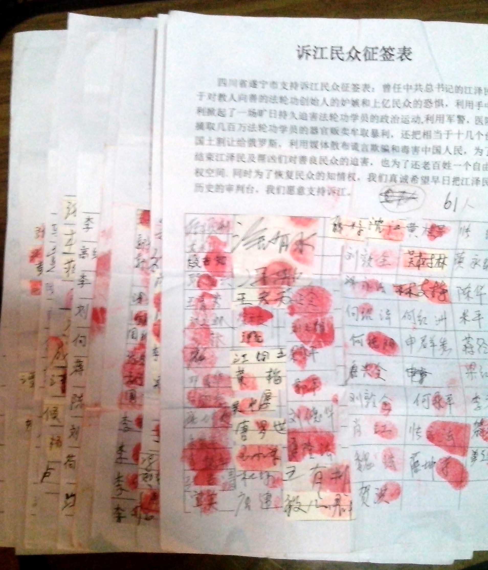 遂宁法轮功学员在讲真相、劝“三:退.”(退出中共及其附属的共青团、少先队)的同时,通过面对面、打电话、发资料、粘贴传单及挂展板等形式,向周围民众及各界人士讲述和传递大陆及全球民众控告江泽民的最新形势。世人听到法轮功学员堂堂正正控告江泽民的消息后,由开始的震惊,继而钦佩,发展到现在纷纷签名支持控告并参与举报江泽民,也有用真名、化名直接上最高检察院、法院网站举报的。