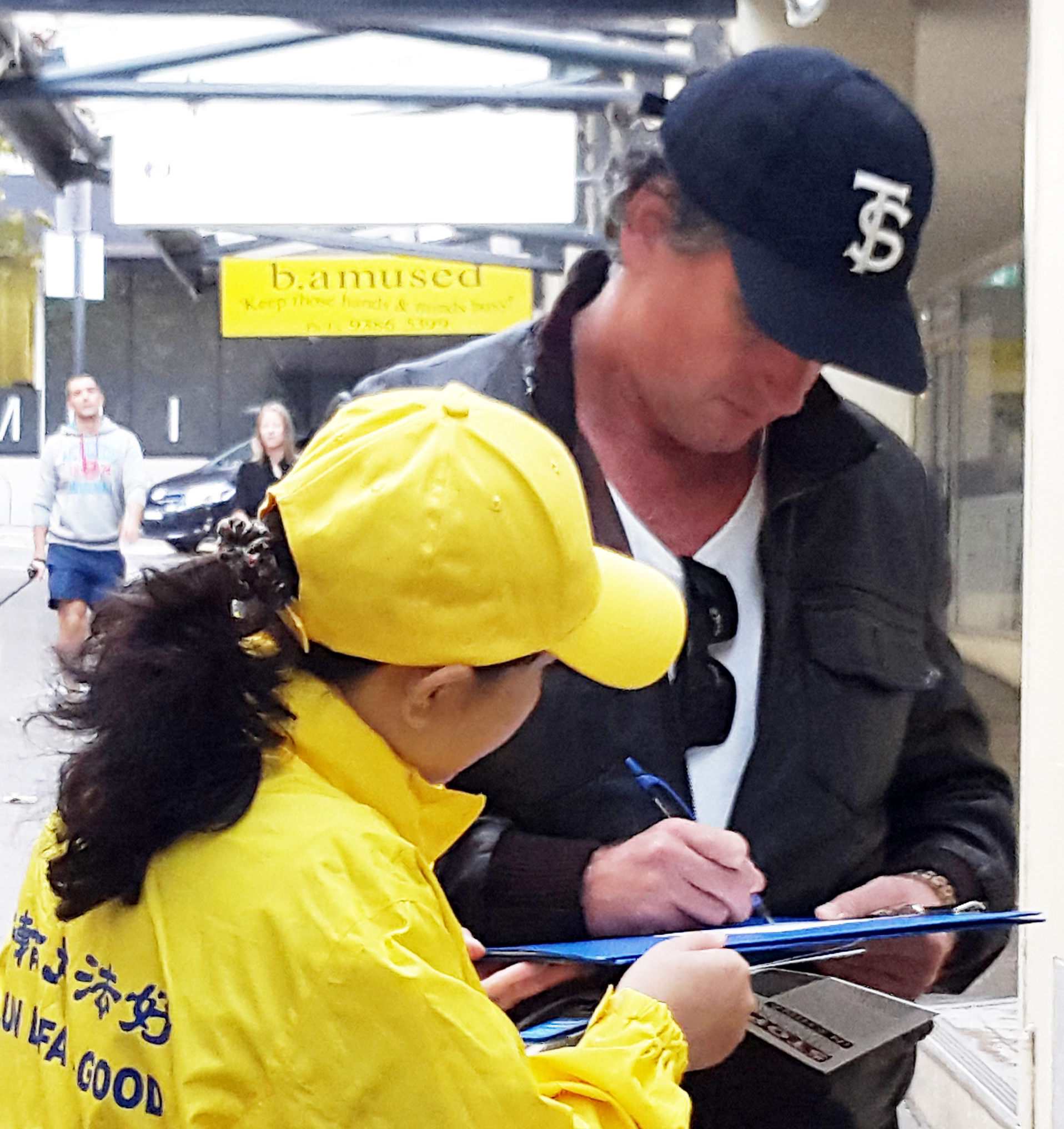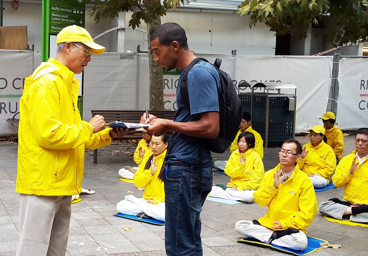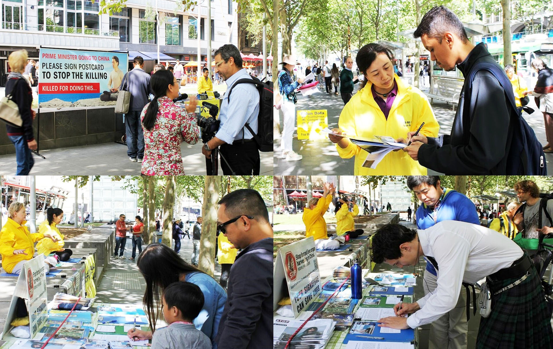法轮功学员在墨尔本各城区,包括距离墨尔本数小时车程的小城市,以及在市中心的常年真相点向民众介绍法轮功反迫害近十七年的真相并征集签名。特别是在繁华商业街的真相点,过往的游客和市民被祥和的功法展示以及真相图片吸引、驻足,他们被骇人听闻的活摘器官真相震惊,有的民众看到呼吁总理关注制止迫害的醒目横幅后主动来签名。