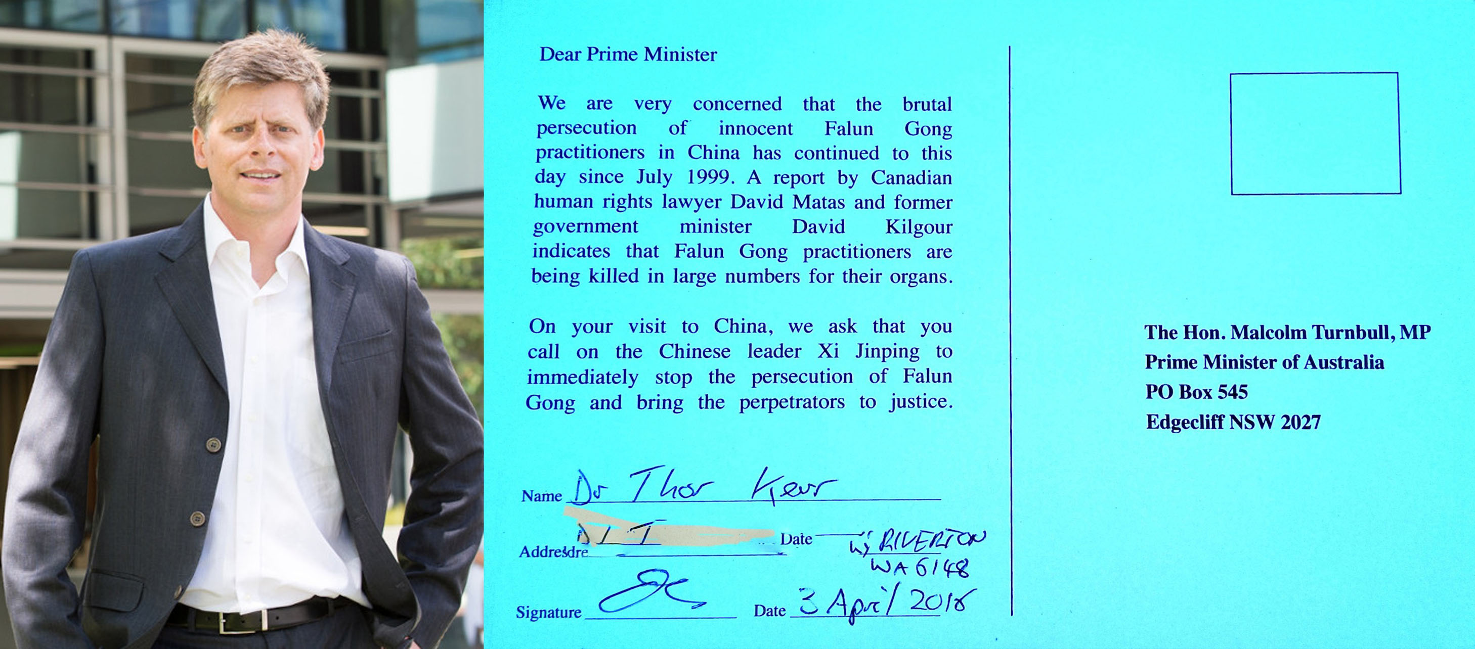 ![]() 绿党候选人索•科尔博士(Dr Thor Kerr)在“明信片”上签名支持反迫害 |