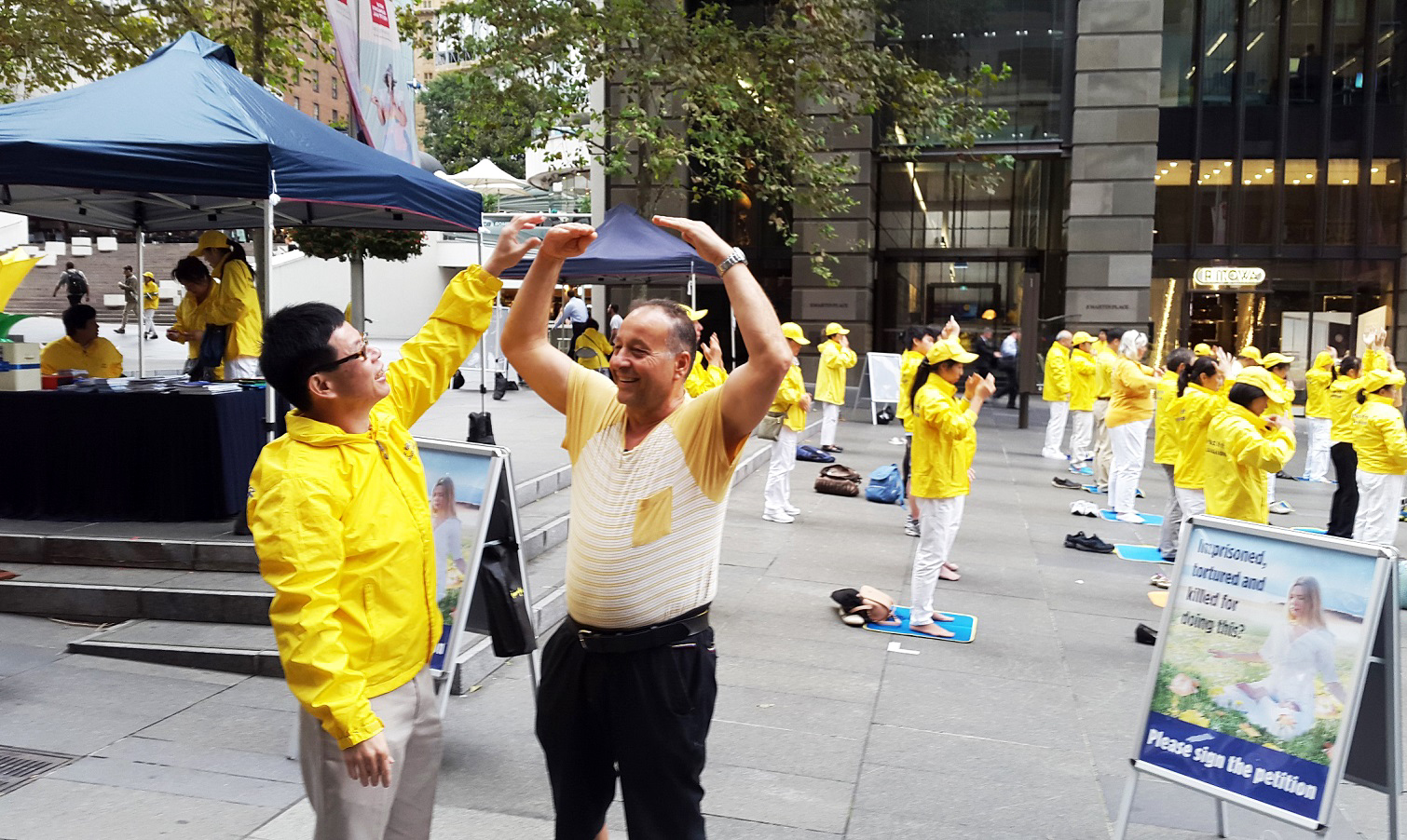 四月七日,法轮功学员在金融和政界聚集地马丁广场(Martin Place)大聚集讲真相活动中,有好多民众除了来签名支持法轮功反迫害之外,还被他们炼功时祥和的场景吸引,有不少人希望当场学习修炼法轮功。有一位西人,他在十年前就看到法轮功,并想修炼,但是他失去了联络方法,这一晃就十年过去了,今天他再次见到法轮功学员,非常激动,毫不犹豫地就加入修炼。