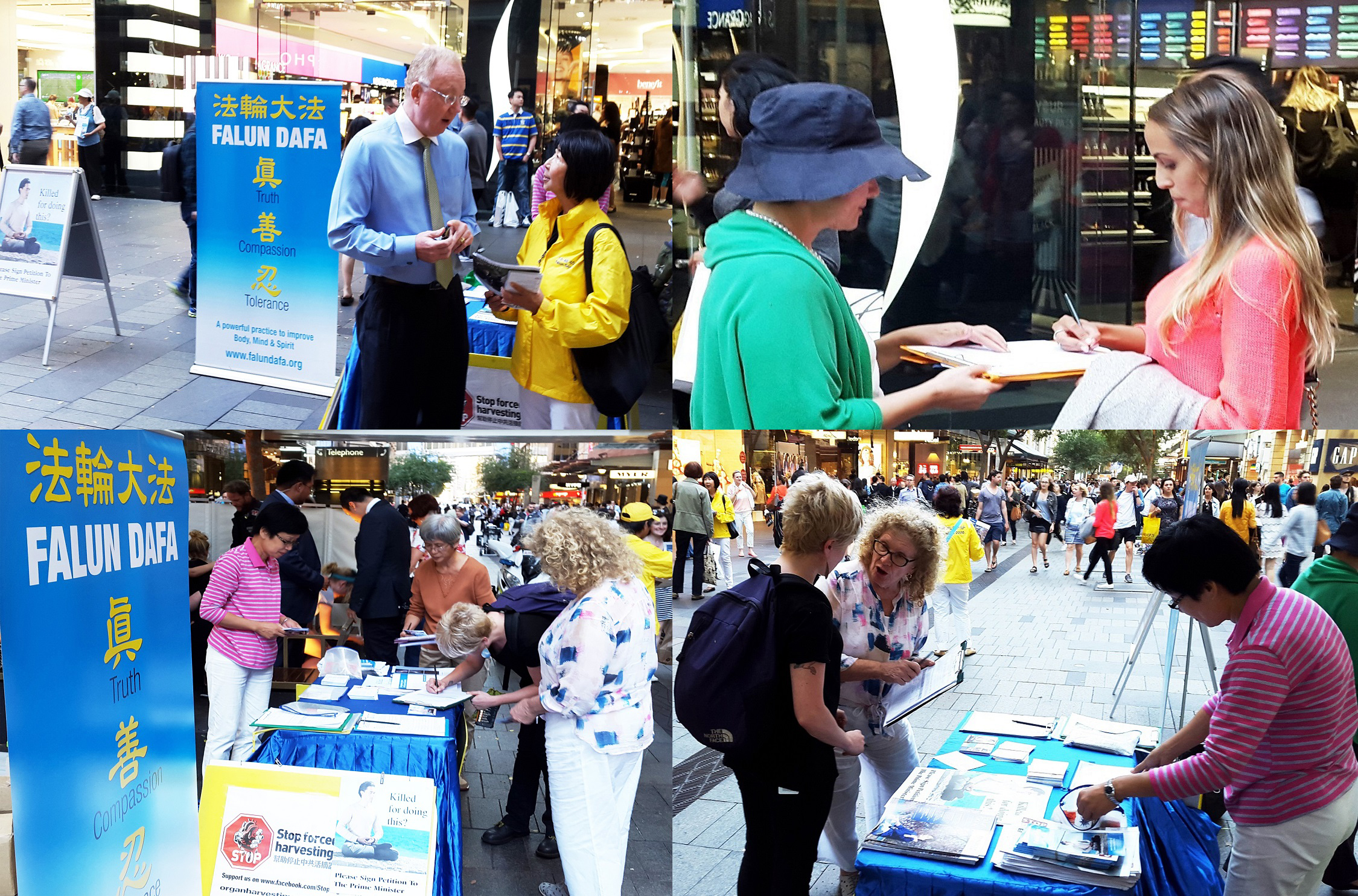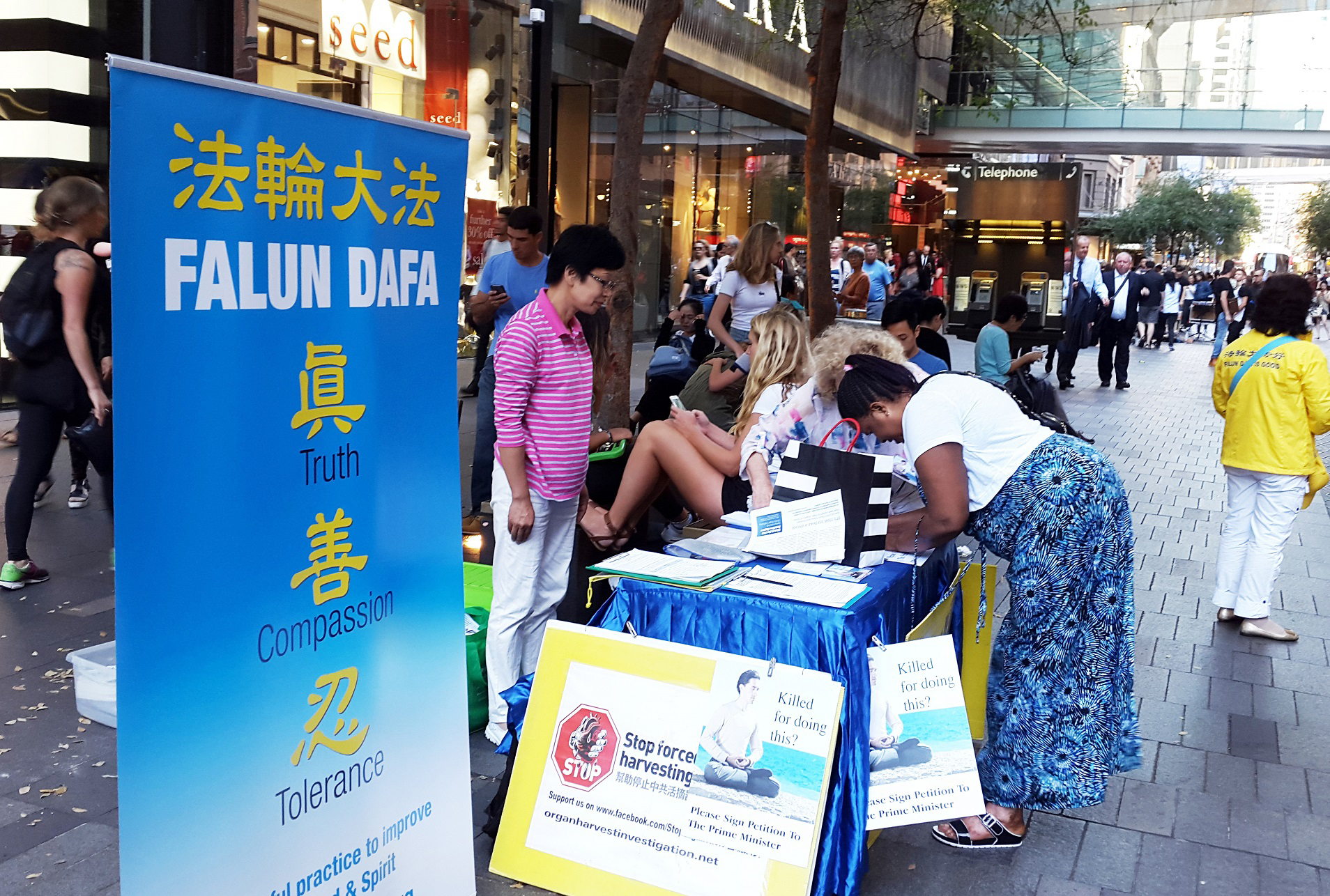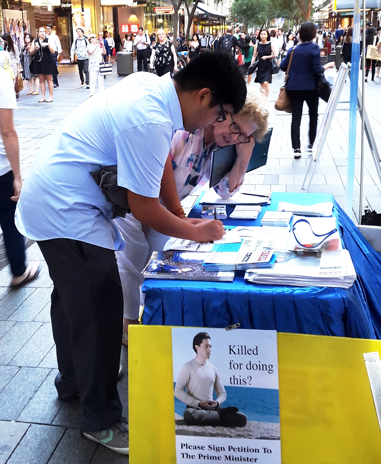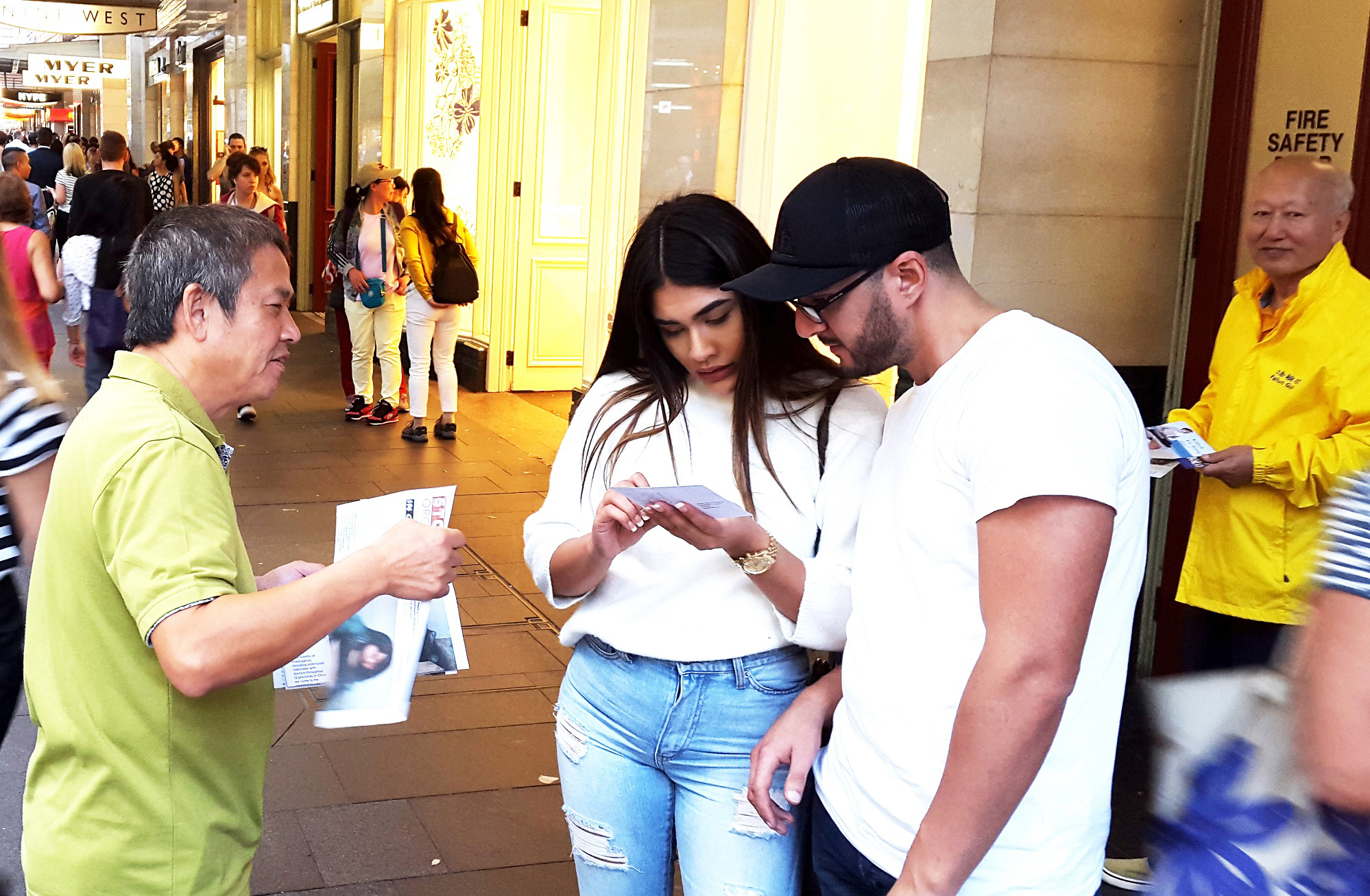 玛丽亚(Maria Dawelln)和男朋友亚当(Adam)一起走过真相摊位,他俩都签名反迫害,也希望澳洲总理能为制止在中国发生的人权迫害发声。亚当表示:听闻这场持久的迫害,我很震惊,你们有没有把这个征签活动的信息放在一个网页上让更多人来签?我希望尽力而为做些什么来帮助制止迫害。我自己会去看并把澳洲电视台SBS Dateline播放的那个揭露中共非法活体摘取法轮功学员器官牟取暴利的纪录片《活摘》(Human Harvest)传给我的朋友看。玛丽亚表示:希望我们能把更多人联合起来加入你们(法轮功反迫害);希望这个迫害赶快结束;希望中国的法轮功学员会很快能自由修炼。