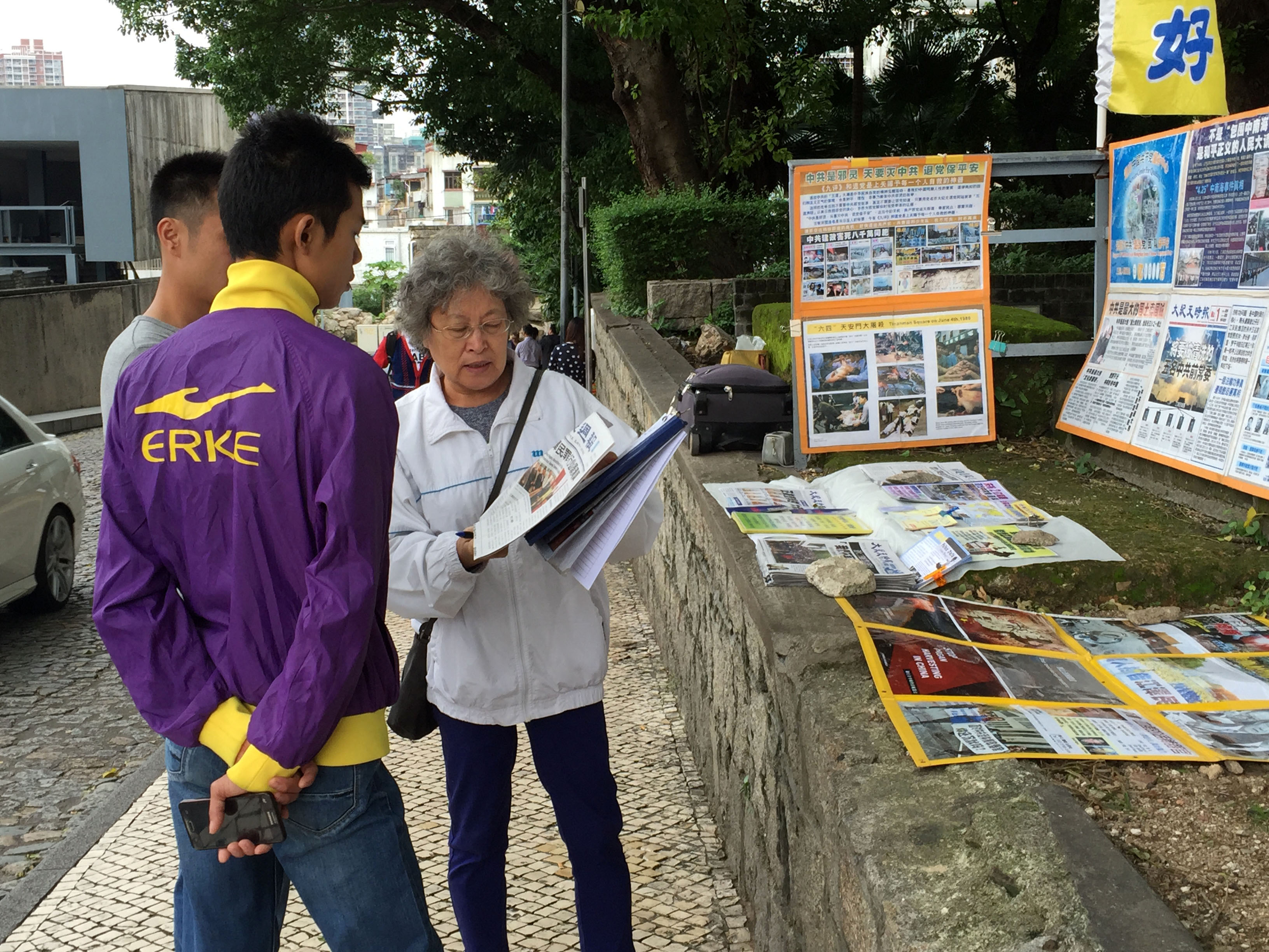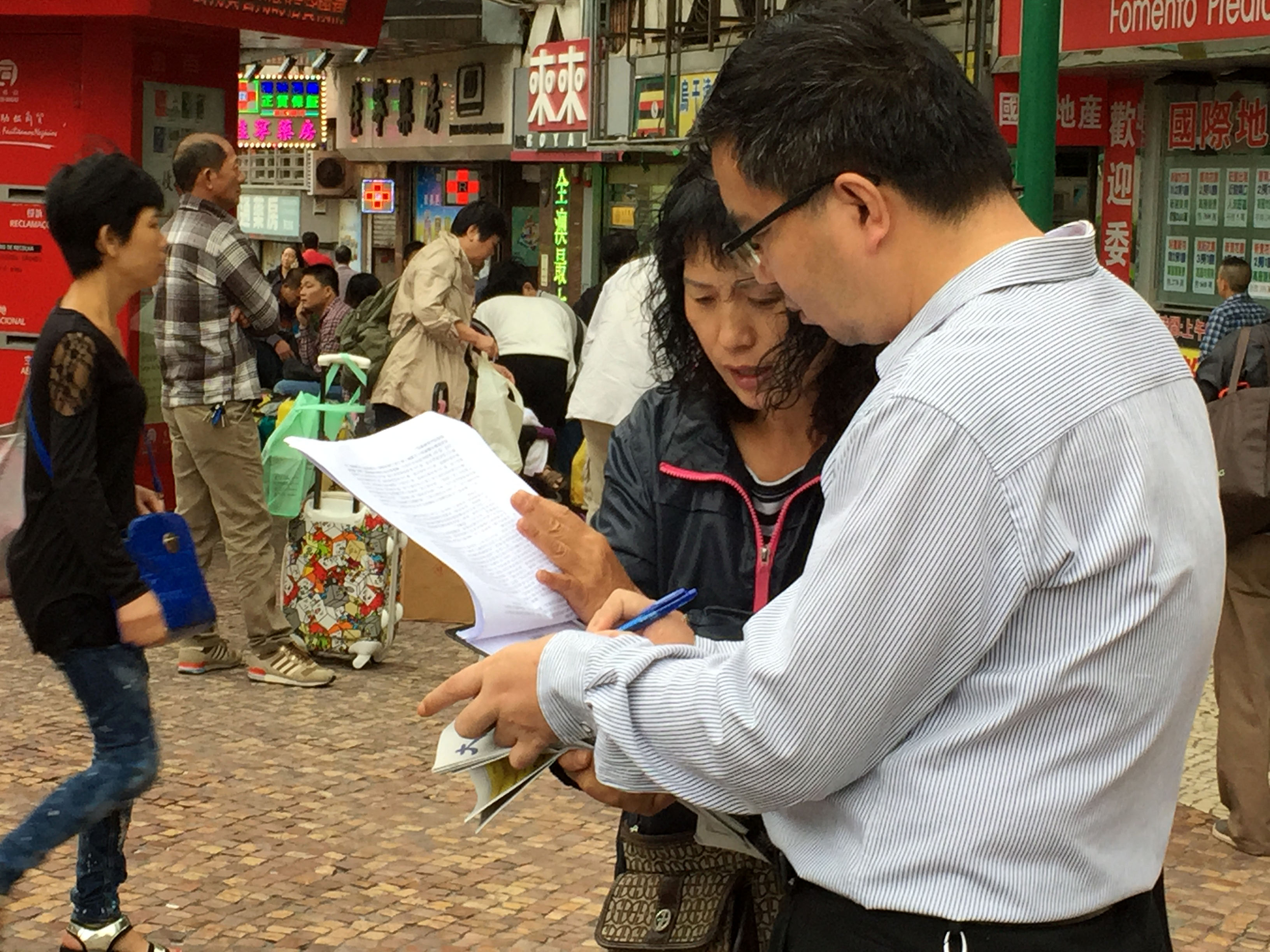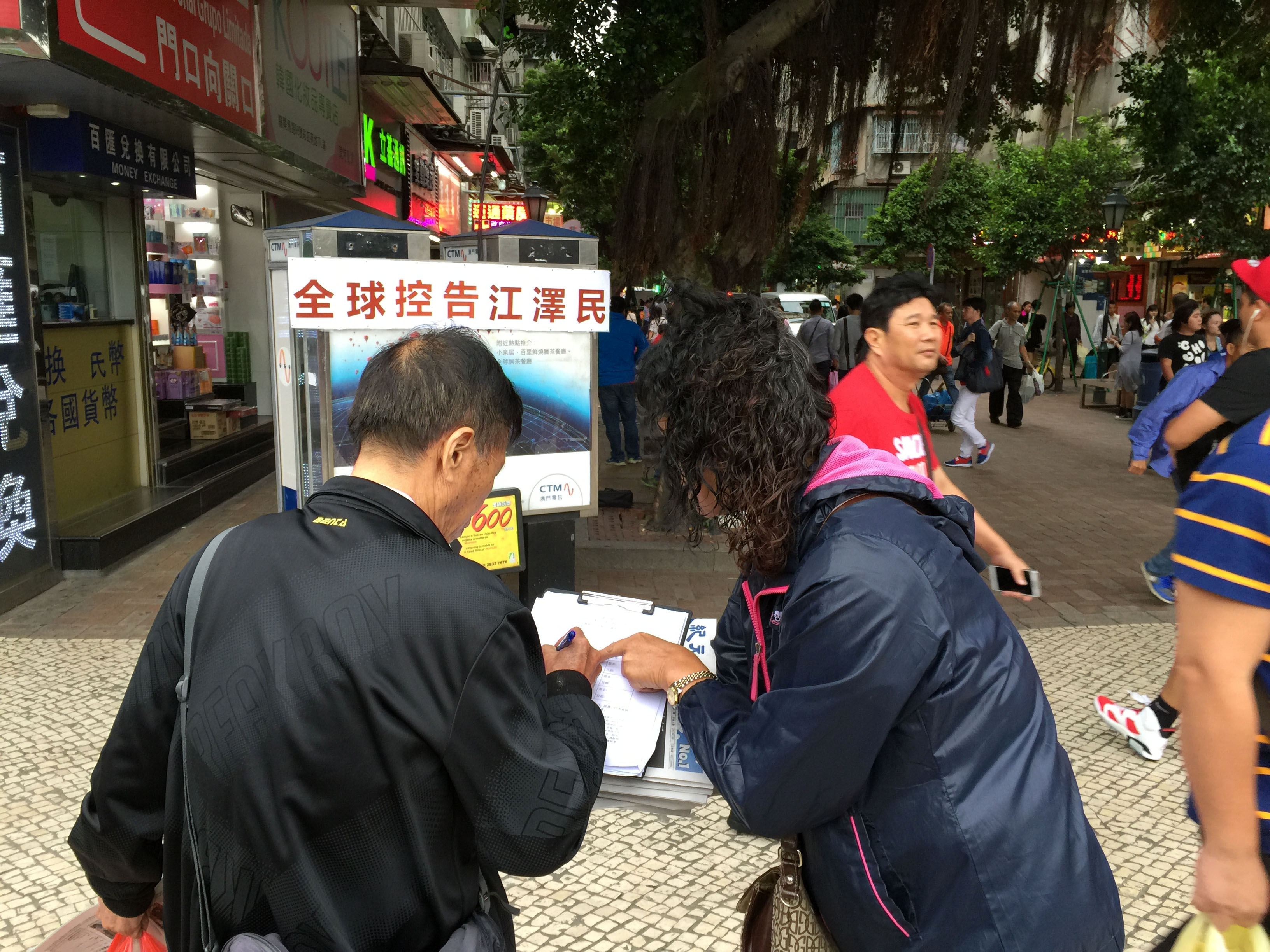 ![]() 图1:声援“诉江大潮”,澳门法轮功学员征集签名、联署举报迫害元凶江泽民。 |