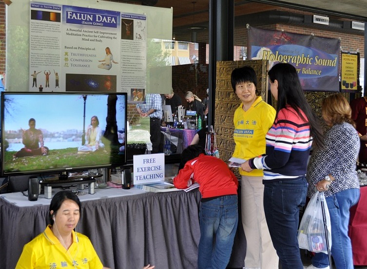 法轮功学员的展位上以法轮大法(法轮功)介绍展板做大幅背景,大屏幕电视上播放着介绍法轮功及功法演示的短片,人们还可以在这里得到各类资料,包括杂志、传单、当地炼功点及今年世界法轮大法日活动的信息。