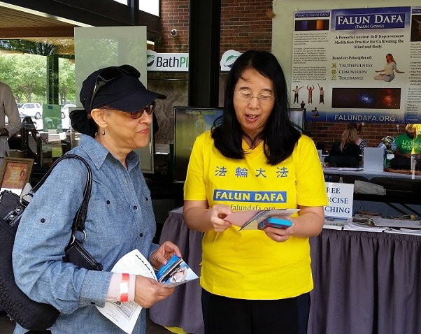 一位亚裔母亲带着儿子听学员介绍后,马上表示要参加法轮功九讲班学习功法,并盼望着参加当地即将举办的世界法轮大法日庆祝活动。当得知这么好的功法却在其发源地中国受到中共严酷打压,甚至有众多修炼人被中共迫害活体摘取器官时,马上就郑重地在呼吁停止活摘器官的征签表上签了名,表示要尽自己的一份力量制止这一恶行。母亲告诉儿子这一情况,儿子也马上在征签表上签了名。