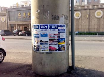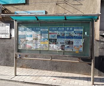 这是哈尔滨市双城区居民院墙上及其他地方随处可见的真相展板和胶贴,有的已经贴一两个月了,村民们说我们知道法轮大法好,早就应该法办江泽民。