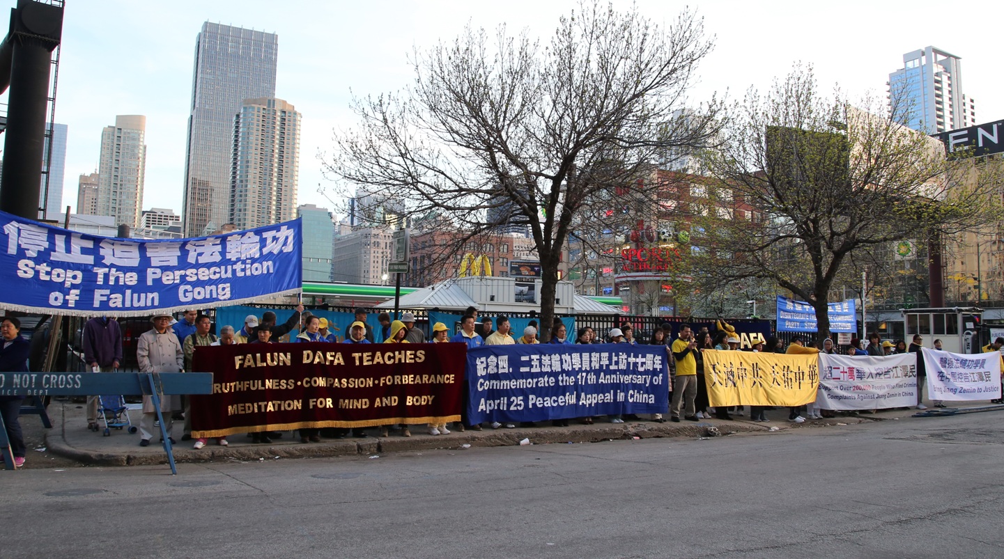 每年的四二五,芝加哥法轮功学员都会聚集到中领馆前,平和而坚定地表达他们的诉求,今年也不例外。下午五点,伴随着祥和的音乐,学员们开始集体炼功。他们打出“纪念四二五法轮功学员和平上访十七周年”、“停止迫害法轮功”、“法轮大法教人真、善、忍”、“解体中共制止迫害”等中英文横幅,吸引了不少路人观看。