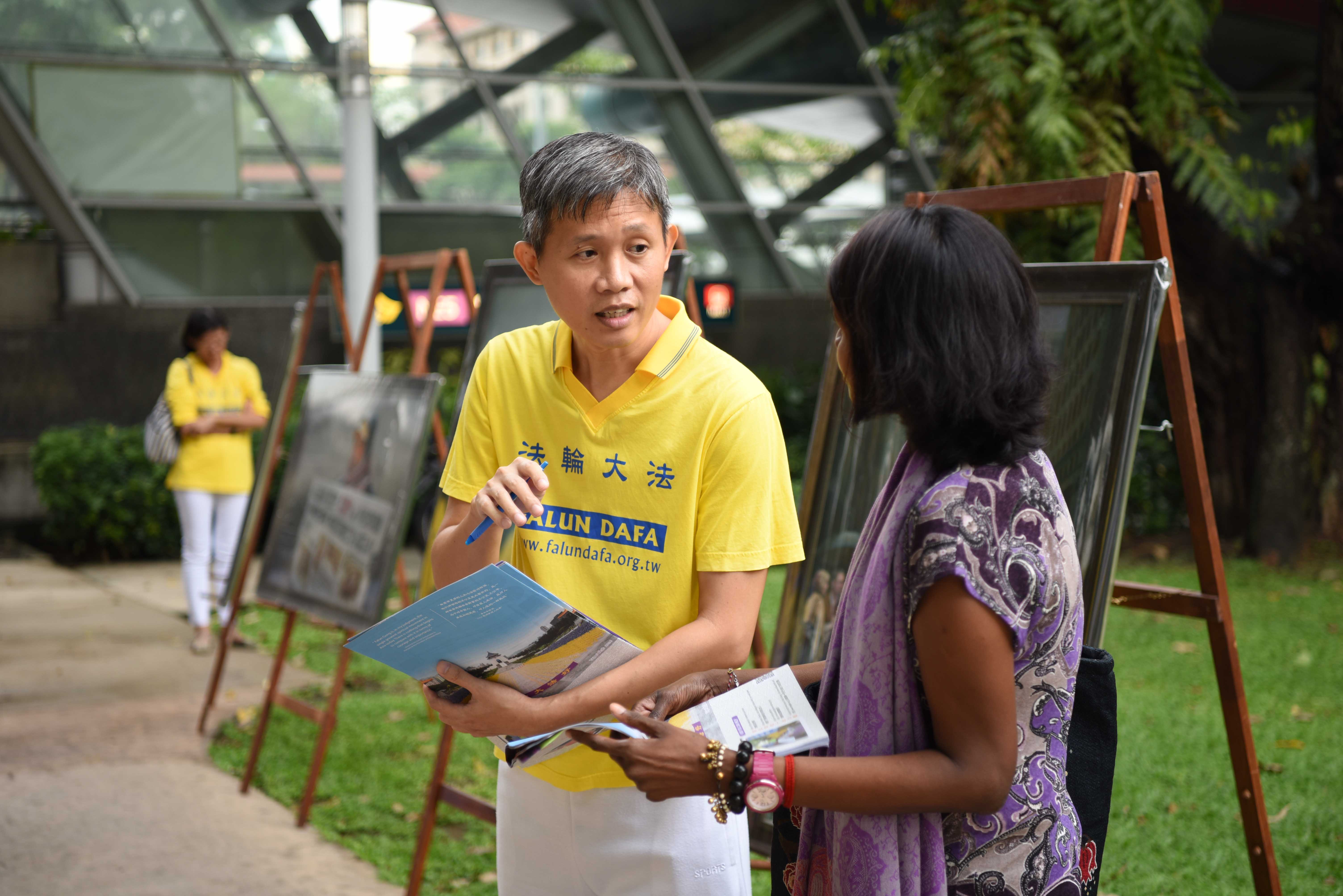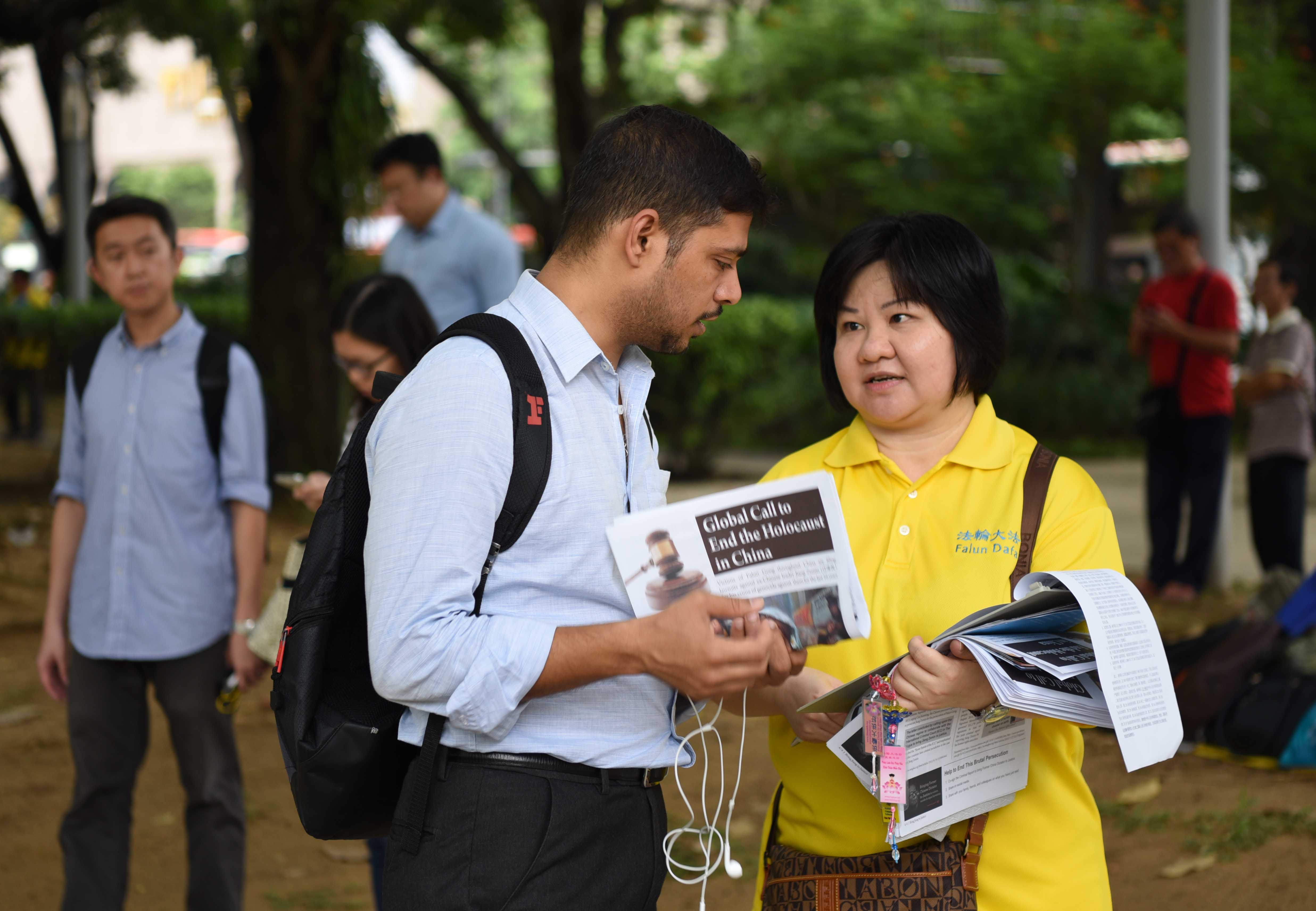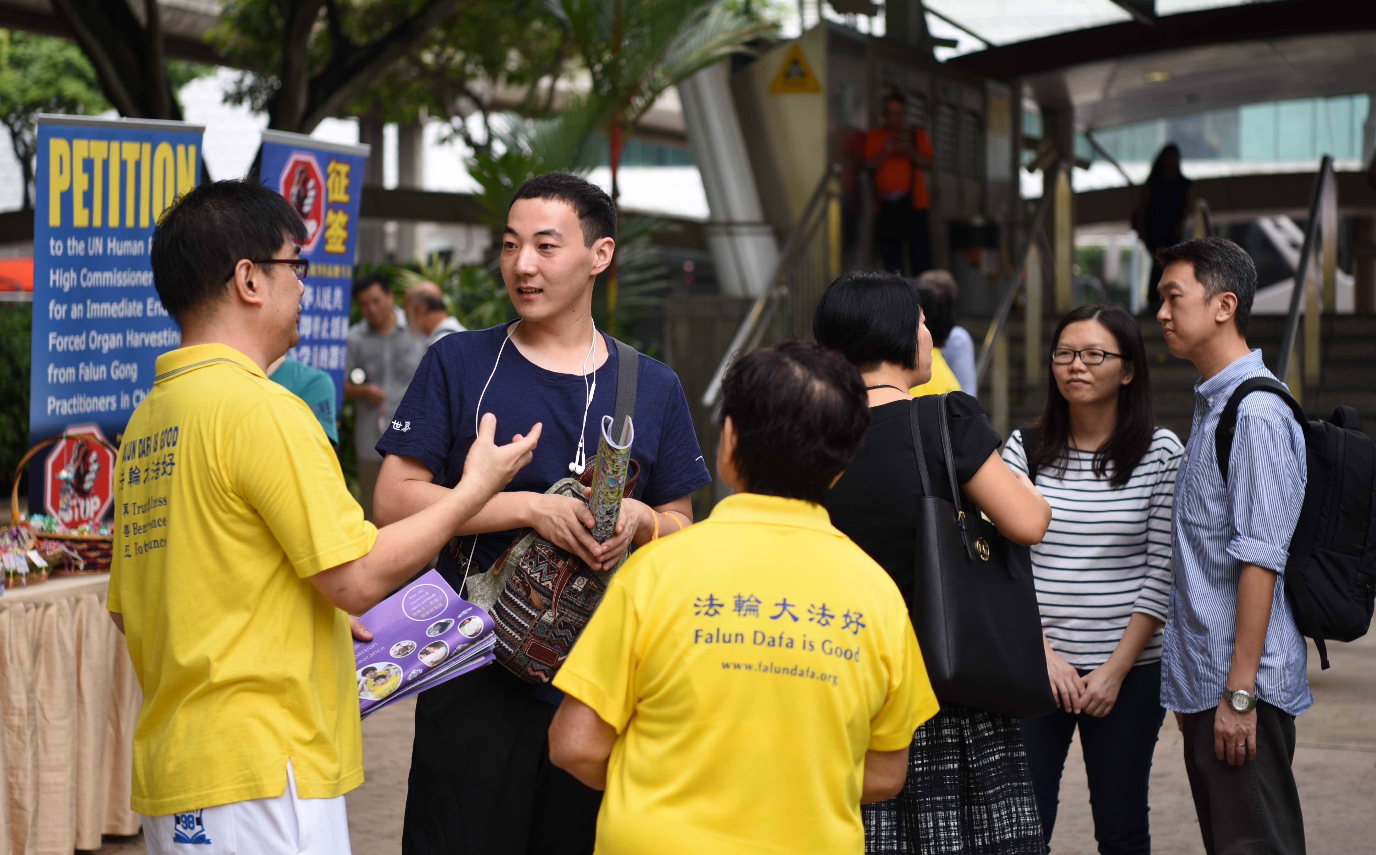 一位来自中国的小伙子到新加坡游玩,碰巧来到学员们的活动现场。他与学员攀谈,索要了真相资料,表示会去多了解一下法轮功真相。他说:“在中国,我处于一个相对封闭的环境,我没有看到过今天这样的场景,我所知道的法轮功也只是政府的一面之词,我对真相比较有兴趣,我会珍惜来在新加坡的机会,一探究竟,包括活摘器官的真相。我希望能多了解一些。”