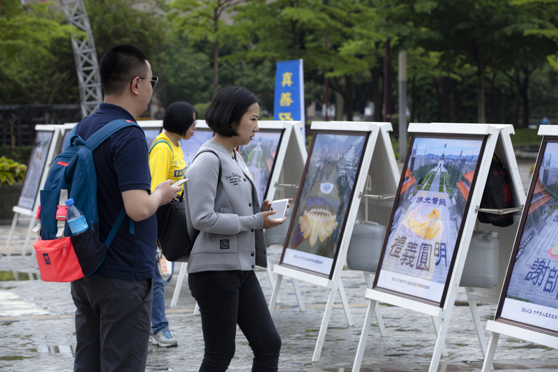 千人集体大炼功所展现法轮大法的美好,传递的真善忍理念,形成一道最美的风景。台北市政府市民广场人来人往,许多大陆游客经过,驻足观看法轮功展版的真相资料,还有人拿起手机拍照。有一对长年旅居法国的华人,羡慕台湾信仰、言论自由,听完法轮功学员讲述真相后,取化名退出中共相关组织。