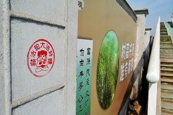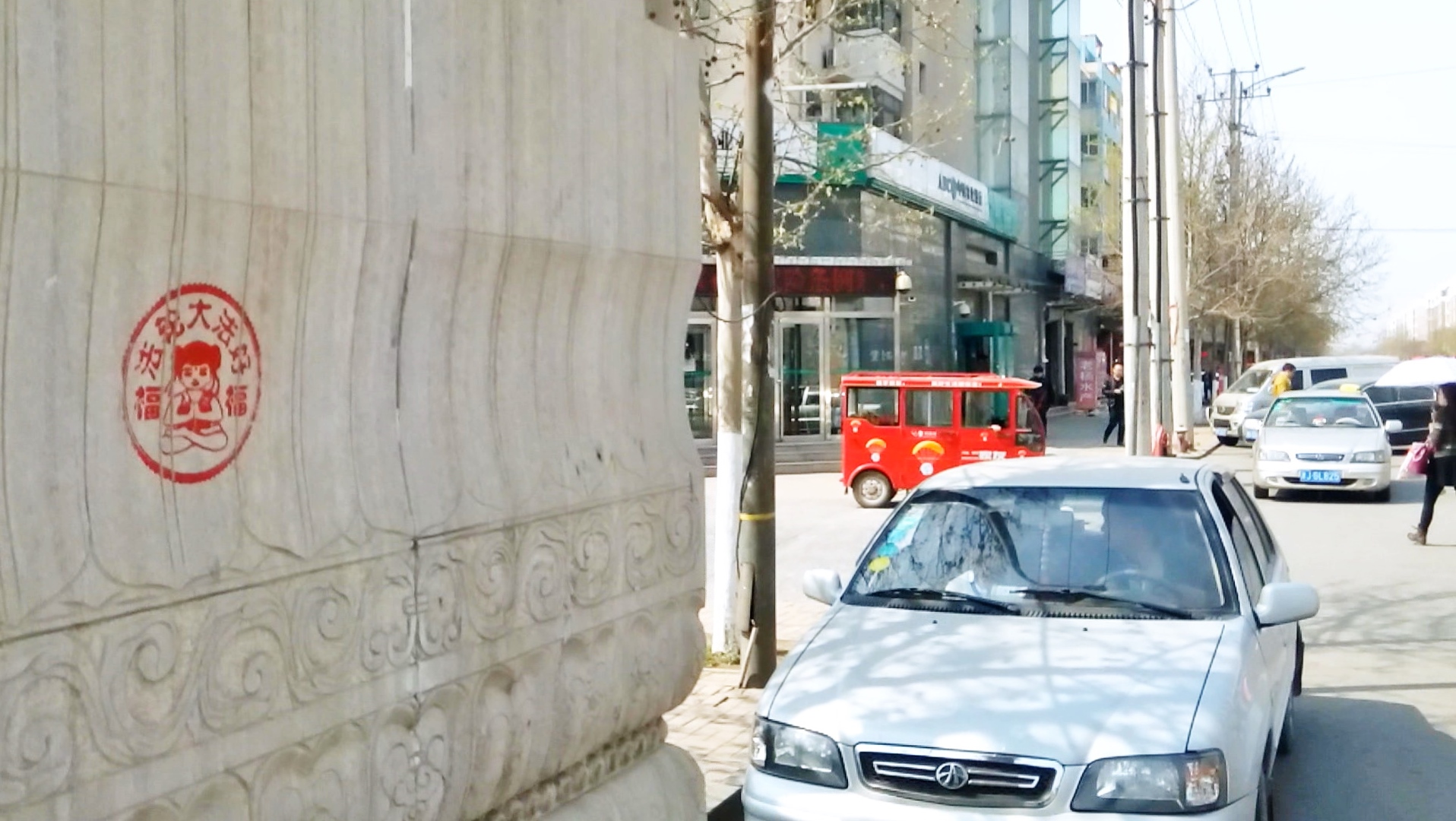 备注:这种墙体大章方式,借鉴了剪纸的样式,图文并茂,形象逼真且优美,发挥了户外标图的作用,做起来相对而言更安全、高效、持久。采取了图形和文字结合,图案化的设计。图案部分采用线条形式的图案,选取图片后用PS将它做成线条化、白描或图章,突出边线等方式,达到方便雕刻即可。