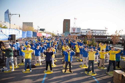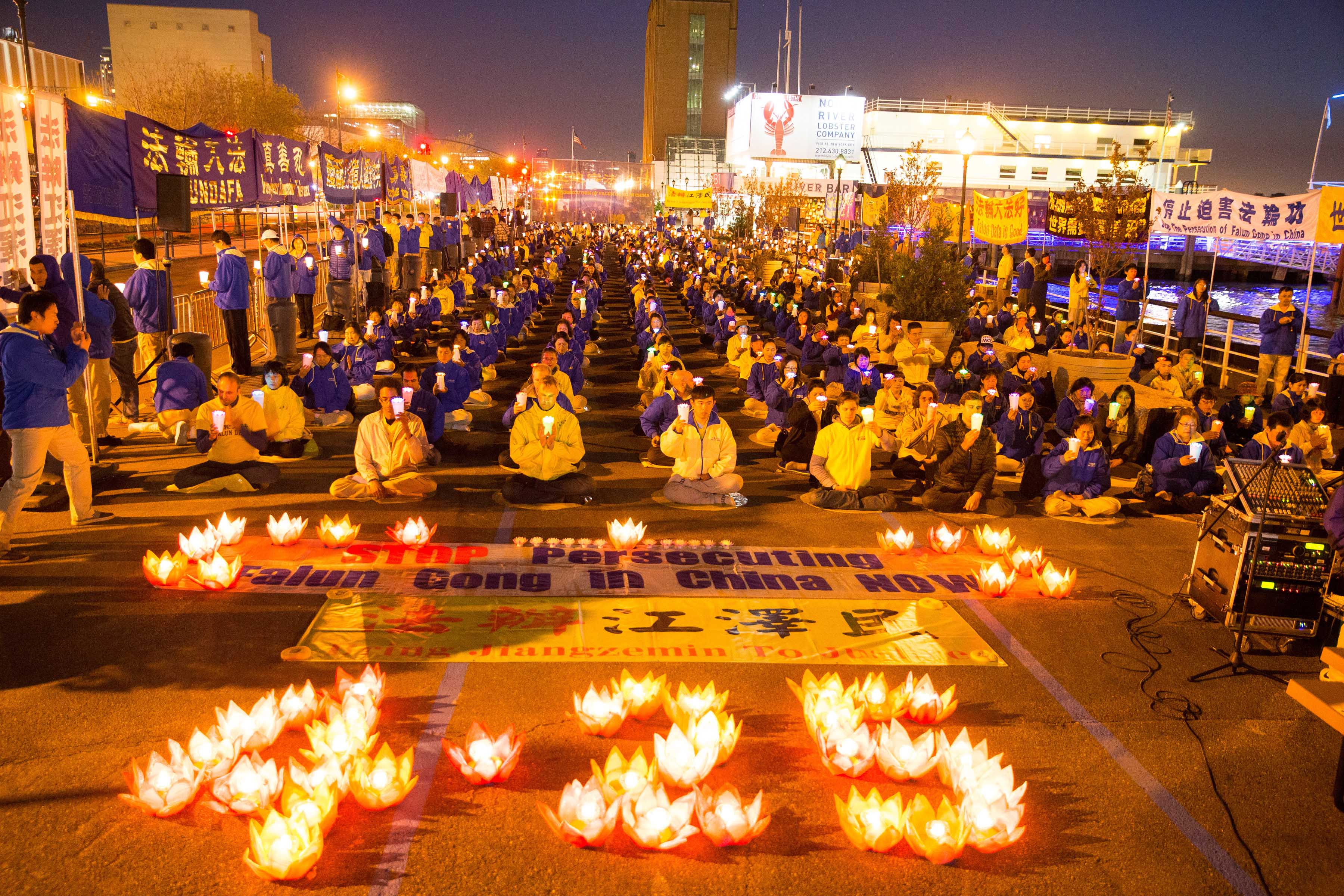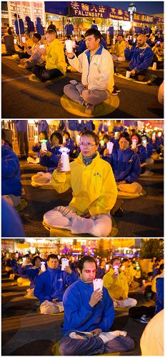 法轮功学员身穿蓝色夹克或黄色T恤,在音乐声中静静地炼功。“法轮大法好”,“真善忍”,“停止迫害法轮功”,“法办江泽民”等横幅环绕在周围。夜幕升起,学员们举起莲花灯烛,场面庄重肃穆。