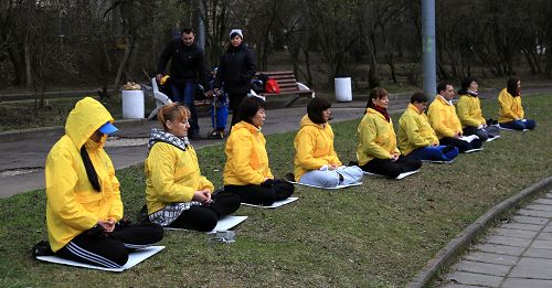 图1-3:二零一六年四月二十五日,莫斯科法轮功学员来到中领馆前集体炼功,纪念四二五法轮功学员和平大上访十七周年。