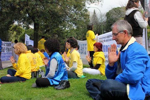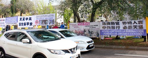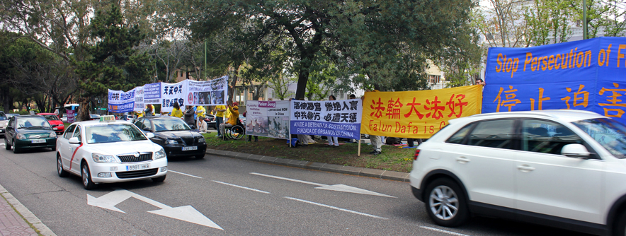 活动当天上午十点半,法轮功学员来到中共驻西班牙大使馆前,学员们在中使馆对面的空地上展开 “法轮大法好”、“真善忍好”、“停止迫害法轮功”、“活摘器官,惨绝人寰”、“法办元凶江泽民”等多面横幅及展板,并伴随着优美祥和的炼功音乐,展示法轮功的五套功法,向过路人们展现法轮功的平静祥和及和平反迫害。人权律师卡洛兹到场声援。