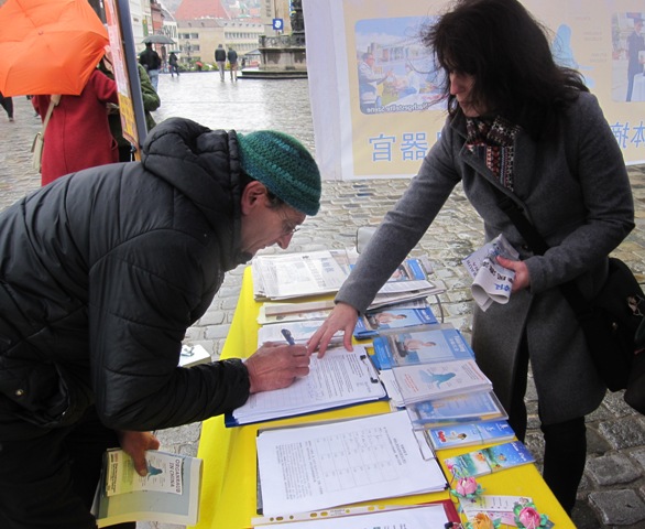 一名德国男子见到法轮功学员,立即签名反迫害,并表示,他儿时起就对东方的修炼感兴趣。他最先学过瑜伽,然后在中国学过一种气功,此外他已经认识很多中文字。他向学员要了有关法轮功的中文资料。