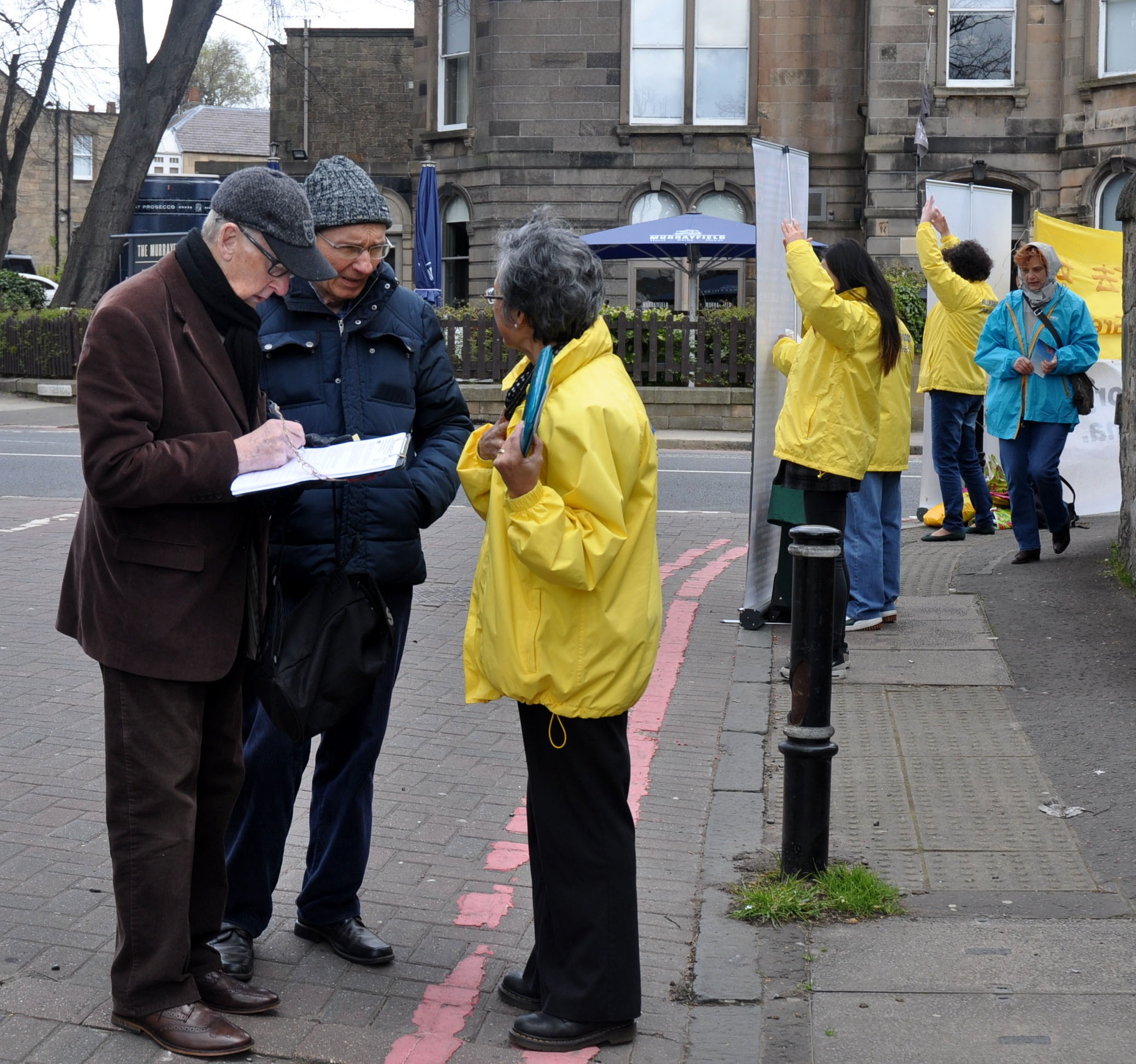 一位母亲上午带着她的三个孩子路过中领馆时,看到了法轮功学员拿在手中有关中共活摘器官的真相展板和横幅,她回家上网查询这方面的资料。下午,她把孩子们安顿好,又返回来表示要在“医生反对强摘器官组织”给英国首相卡梅伦的征签表上签名。她说:“我开始真不敢相信会有这样的事情发生。上网查询后,太令我震惊了。我能不能在你们的征签表上签名?”这位母亲知道法轮功。她说以前见到过法轮功学员在领馆前的和平抗议。这位母亲对大法弟子说:“谢谢你们,要坚持下去。”