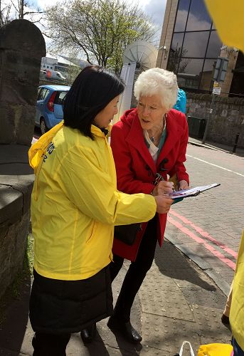 ![]() 图3:英国苏格兰民众和法轮功学员交谈,了解真相 |