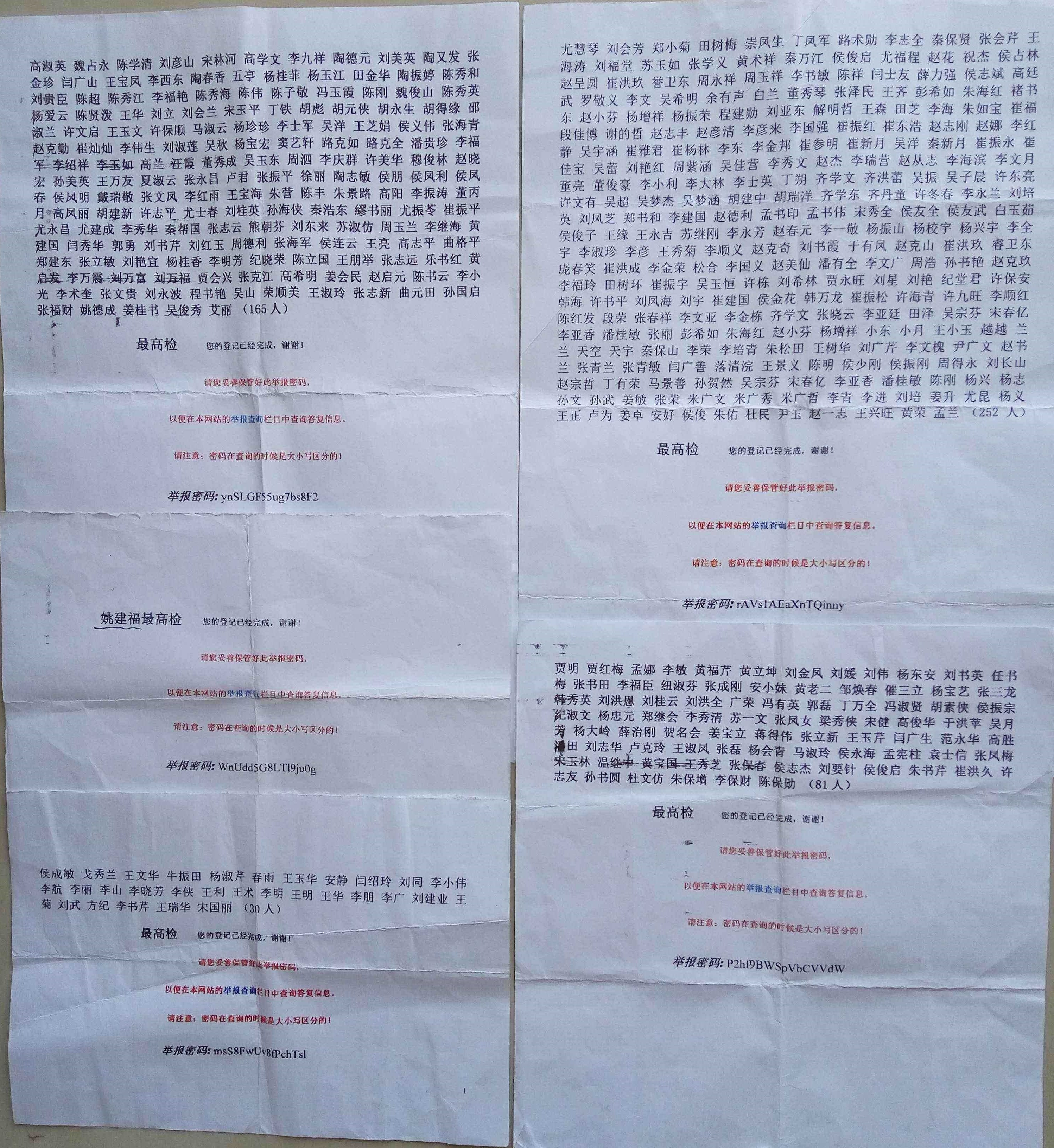图2:通过网络送至“两高”的举报江泽民的部分征签名单及收到的回执查询密码: |