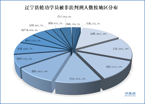 在过去的十六年里,中共一直以非法判刑的手段对无辜的法轮功学员进行迫害。从一九九九年七月到二零一三年七月,明慧网上关于法轮功学员被非法判刑的报道就有一万一千五百九十七例,其中东北三省以及河北、山东是迫害最为严重的地区。辽宁省为一千一百多例,居全国第二位。据明慧网曝光的不完全统计,辽宁法轮功学员被非法判刑为一千七百四十五人次。下面是辽宁法轮功学员被非法判刑地区分布示意图表:
