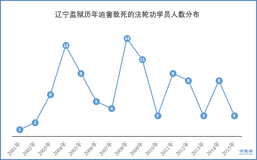 3、辽宁监狱历年迫害致死的法轮功学员情况数据图表: