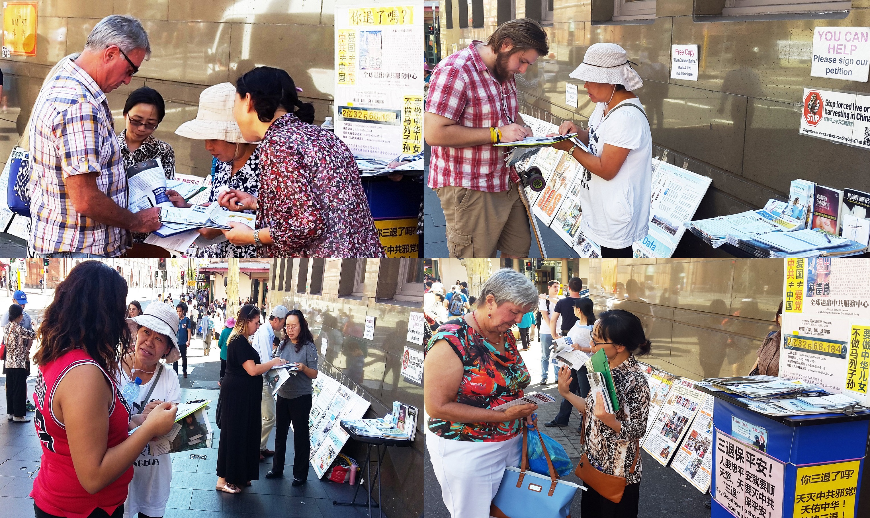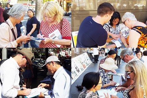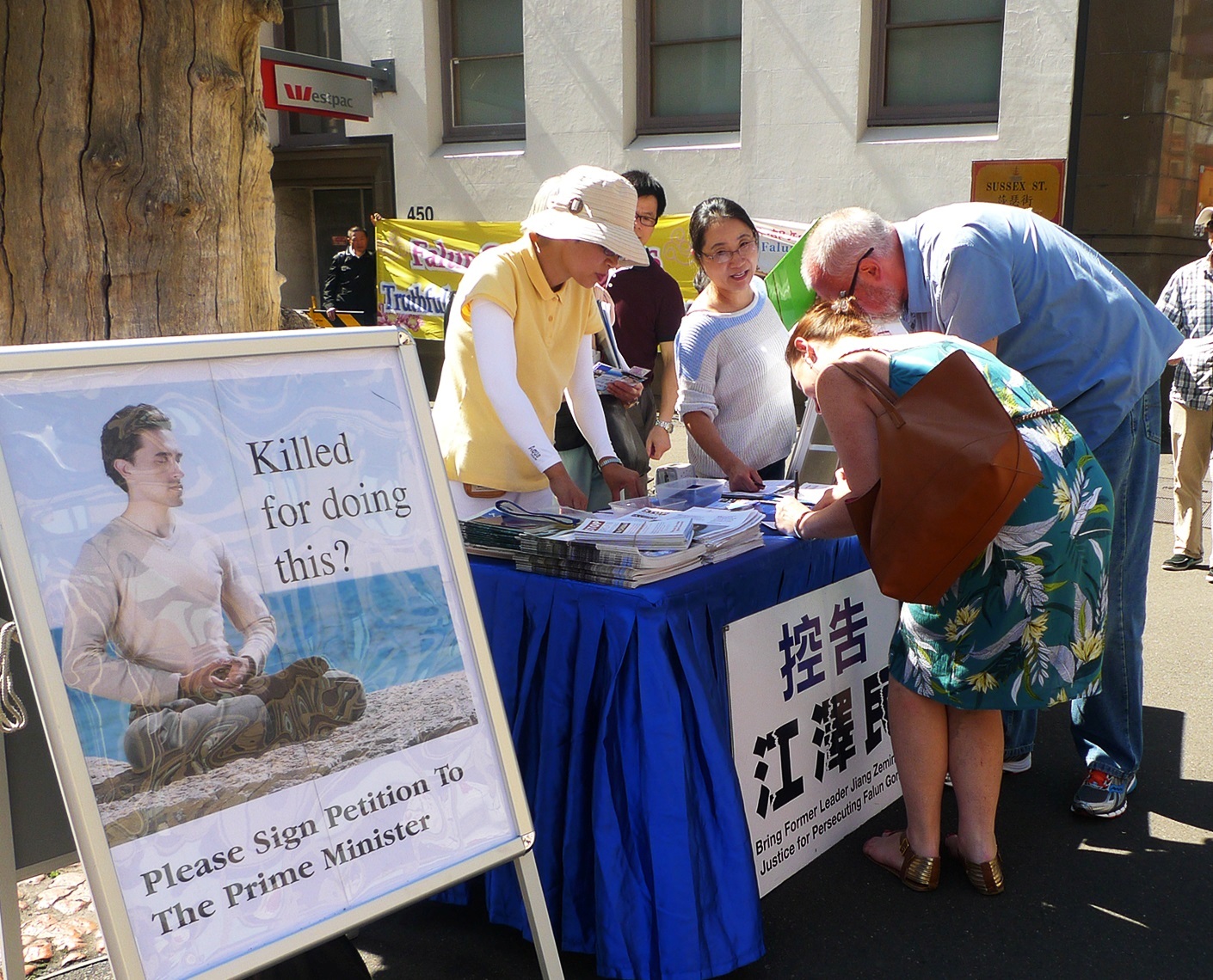 科斯蒂女士(Kirsty M)走过法轮功真相摊位前,和法轮功学员瑞秋(Rachael)谈到她曾经在香港看到过类似的法轮功学员讲真相摊位,在那里她了解到法轮功被迫害真相,感觉很难过。所以今天她看到这个征签活动,直觉应该过来签。她在明信片上签名后表示:澳洲总理应该在去中国时提出这个(制止迫害法轮功)人权问题。过几天我就要去中国开一个工作会议,我将告诉中国朋友,全国世界都在呼吁制止迫害法轮功,我在香港和悉尼都看到了。