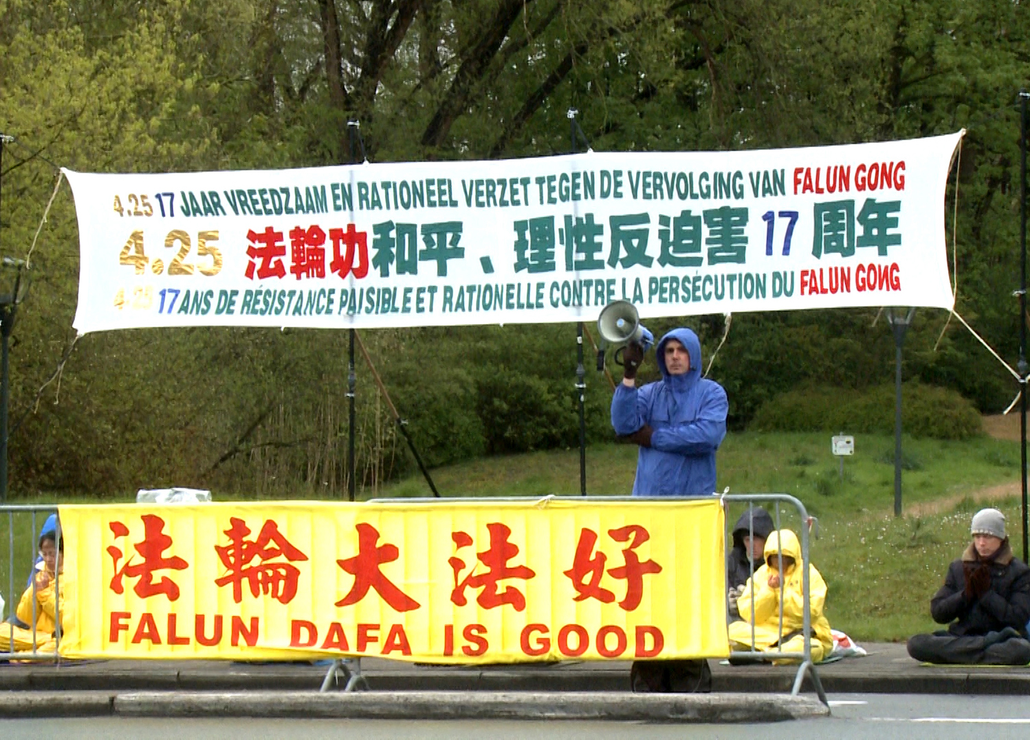 四月二十七日上午,法轮功学员在中共驻欧洲办事处前打出“4·25法轮功和平、理性反迫害17周年”,“法轮大法好”,“解体中共 停止迫害”等多种语言横幅,并播放“4·25上访”和天安门“自焚”伪案,中共构陷法轮功的真相广播。引起过往车辆和行人的关注。法轮功学员并规劝中共官员远离邪*党-、做一个有良知的中国人。