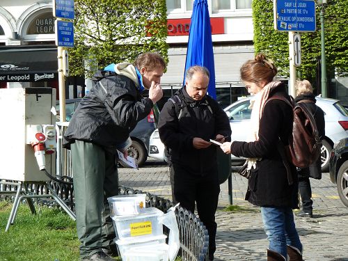 当天上午,法轮功学员在中共驻欧洲办事处前集会,揭露中共迫害法轮功的真相,同时规劝中共官员远离邪*党-、做一个有良知的中国人。下午法轮功学员来到欧洲议会前继续举办讲真相活动,要求欧盟采取行动,制止中共活摘法轮功学员器官牟利的罪恶,法办迫害元凶。欧洲经济和社会委员会前主席Henry Malosse和人权无疆界主任Willy Fautre到场声援。