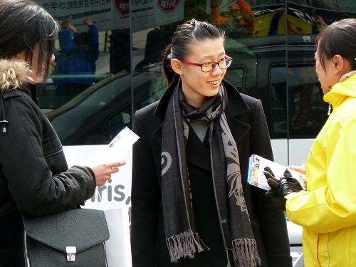 ![]() 图2:学员向过往路人讲述法轮功的真相。 |