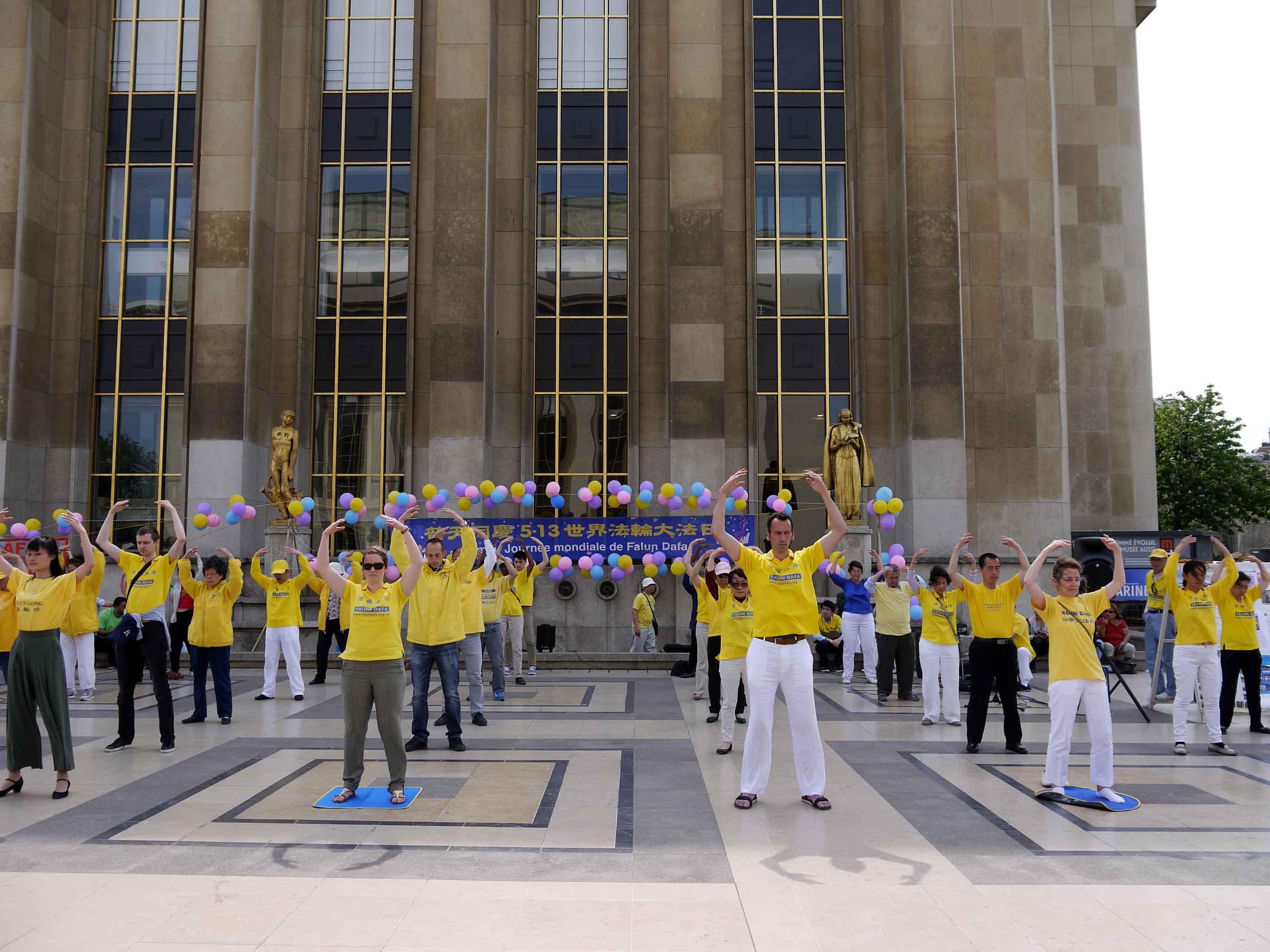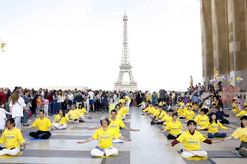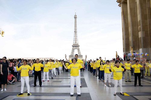 图1-3:二零一六年五月八日星期日下午,法国法轮功学员聚集在艾菲尔铁塔下的人权广场上,举办庆祝“五一三”世界法轮大法日,并表达对大法师父的感恩。图为法轮功学员集体炼功,向世人展示大法的美好。