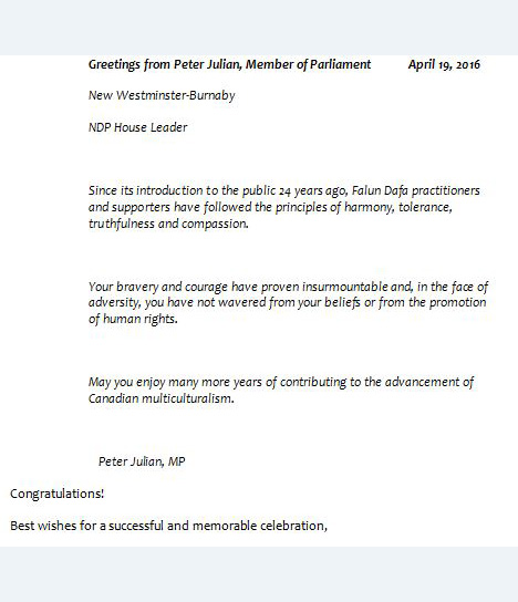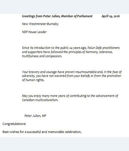 加拿大卑诗省本拿比-新西敏选区(New Westminster-Burnaby)国会议员朱利民(Peter Julian)的贺信译文如下: