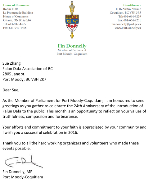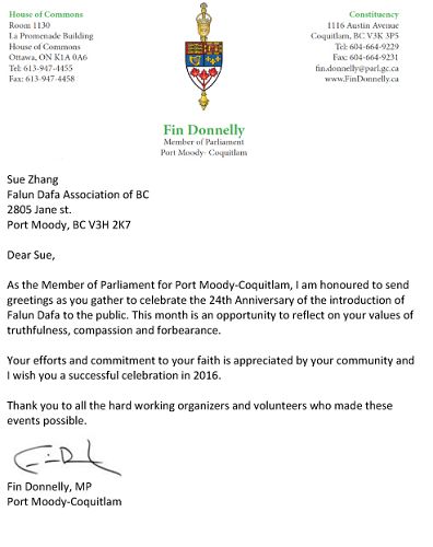 加拿大卑诗省高贵林-满地宝选区(Port Moody—Coquitlam)国会议员唐耐励(Fin Donnelly)的贺信译文如下: