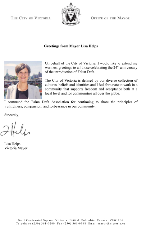 谨代表维多利亚市,向所有参加法轮大法传世24周年庆祝活动的人们致以最诚挚的问候。