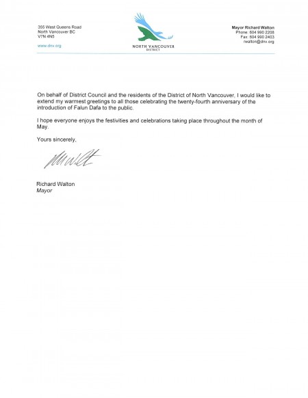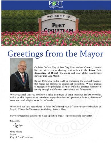 谨代表高贵林港及市议会,向卑诗省法轮大法学会和全球的法轮大法修炼者致以最美好的祝愿。