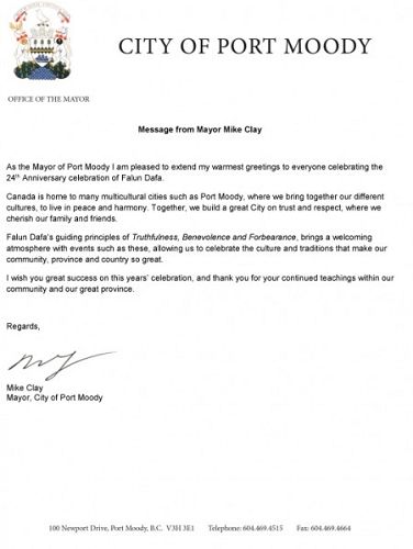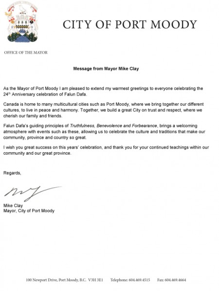 满地宝(Port Moody)市长克莱(Mike Clay)的贺信译文如下: