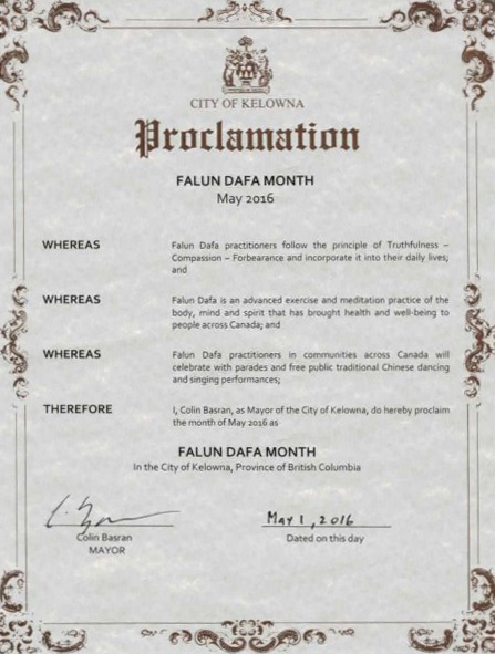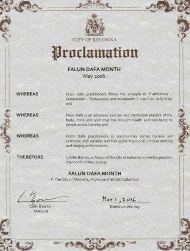 加拿大卑诗省基隆拿市(Kelowna)颁发褒奖,宣布二零一六年五月为“法轮大法月”。褒奖译文如下: