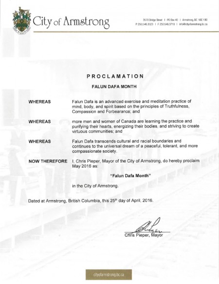 加拿大卑诗省阿姆斯特朗市(Armstrong)颁发褒奖,宣布二零一六年五月为“法轮大法月”。褒奖译文如下。