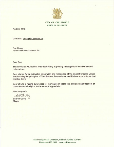 卑诗省三角洲市(Delta)市长露易丝·杰克逊(Lois E. Jackson),卑诗省奇利瓦克市(Chilliwack)市长莎伦·盖茨(Sharon Gaetz),卑诗省寇蒂尼市(Courtney)市长简古拉(Larry Jangula),卑诗省佛农市(Vernon)市长芒德(Akbal Mund),卑诗省兰里区(Township of Langley)市长弗洛斯(Jack Froese)等,也纷纷发出贺信和褒奖,庆祝法轮大法弘传世界二十四周年。