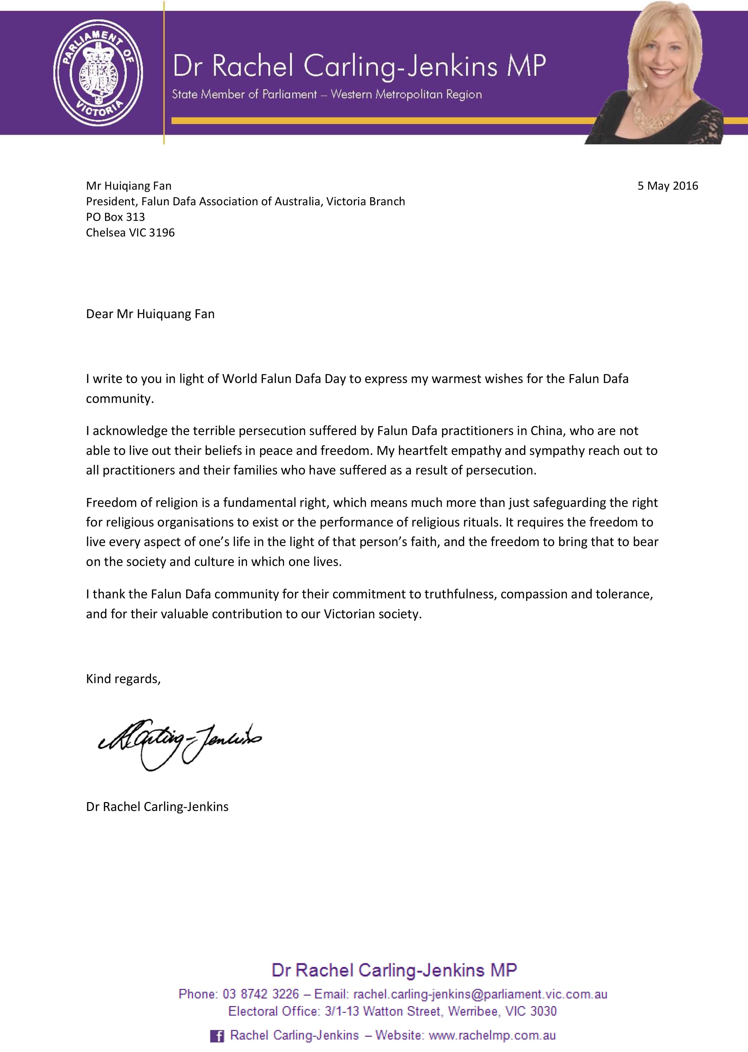 图10:维省民主工党上议员卡琳杰肯斯(Dr Rachel Carling-Jenkins)博士为世界法轮大法日庆典发来的贺信。