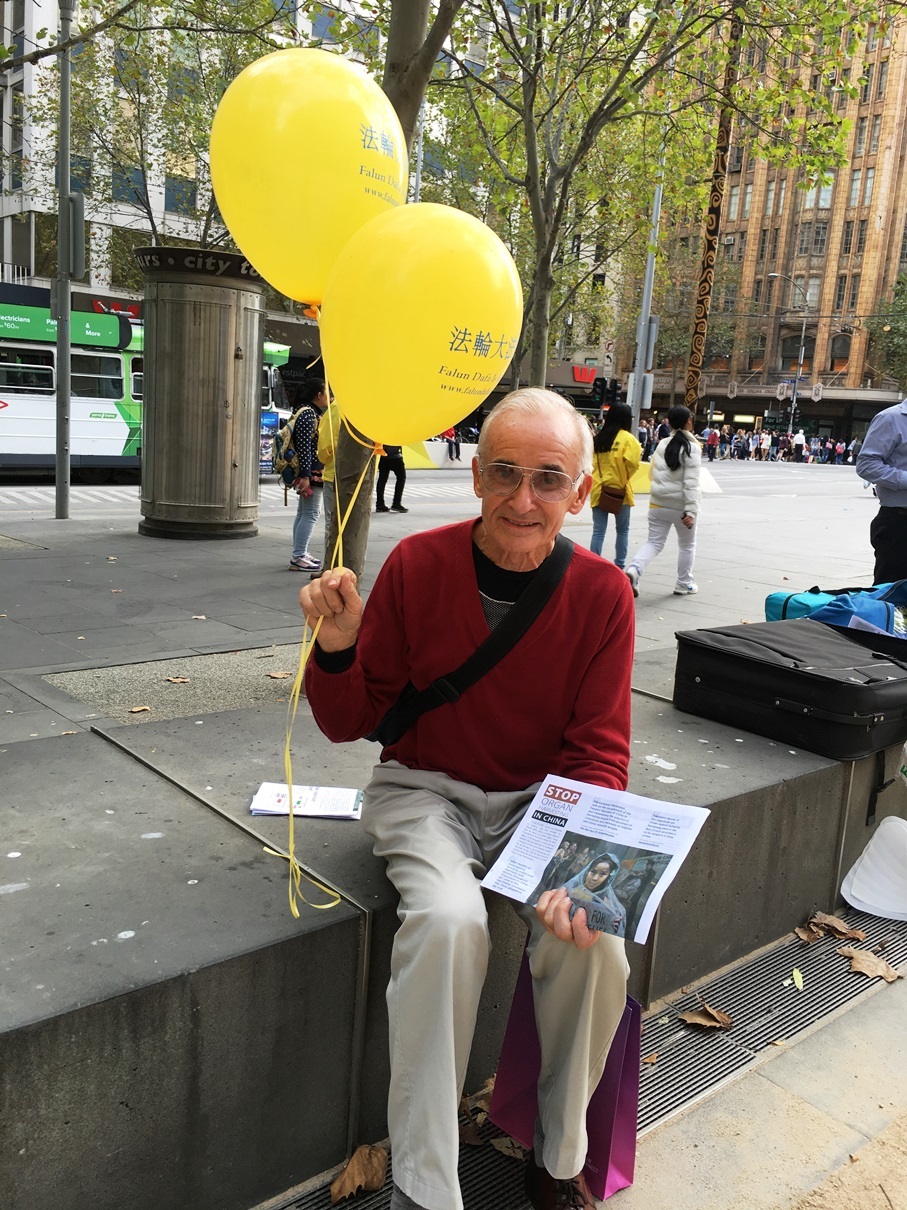 在墨尔本古典音乐教育领域辛勤耕耘二十五年、桃李满天下的音乐家奎恩(Barry Quinn)先生,已经八十高龄,但精神矍铄。他当天在市区一个人逛街,欣赏到了法轮功学员的表演,非常开心。