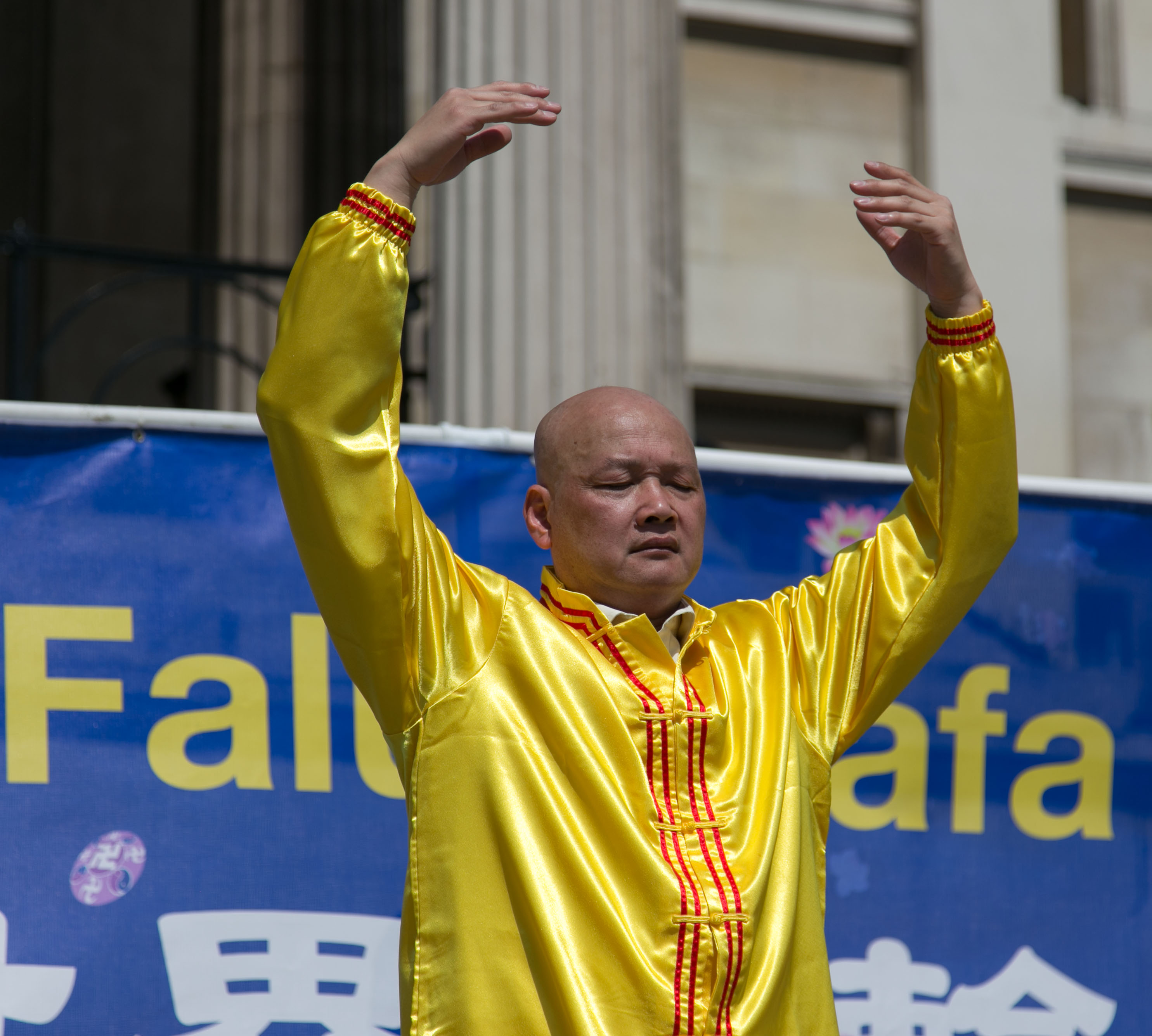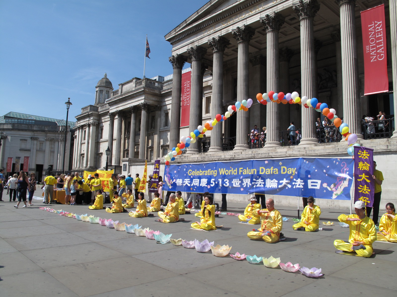 这是二零一六年开春以来英国天气最好的一天,阳光普照,晴空如碧。 “普天同庆5•13世界法轮大法日”的巨大横幅清新醒目,其两侧对称摆置着“法轮大法好”和“真善忍”条幅,横幅之上,装饰着一道用七彩气球搭起的彩虹。身着金黄色炼功服的法轮功学员在横幅前炼功。在横幅旁边,是法轮功学员设立的真相信息台,上面放有介绍法轮功真相的多种资料以及呼吁世界政府和民众支持法轮功学员反迫害、要求中共停止迫害法轮功、停止活摘法轮功学员器官的征签表。另外,多名法轮功学员在人群中发放真相传单和讲真相。