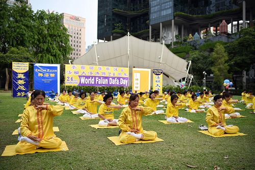 ![]() 图2-3:新加坡法轮功学员集体炼功庆祝世界法轮大法日,与民众分享大法的美好。 |